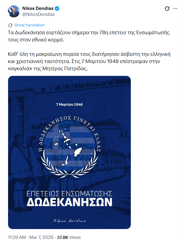 GREEK DEFENSE MINISTER DENDIAS'S STATEMENT REGARDING THE "GREEK CHRISTIAN IDENTITY" OF THE DODECANESE ISLANDS REFLECTS A CRUSADER MENTALITY