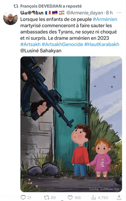 This is a U-turn for Mr. Devedjian. The son of Patrick Devedjian, the lawyer of JCAG and ASALA terrorists who perpetuated assassination campaigns against Turkish targets (specifically diplomats and their family members), he had advocated a nationalism as radical as the one of his father for years, and with a wording at least as virulent as the one of his father. For example, in February 2024, he re-posted on social media an explicit call to bomb Turkish and Azerbaijani embassies (please see the screenshot at the end of this article).