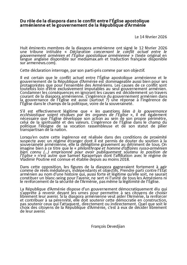 In February 2026, François Devedjian has published a kind of communiqué on the same issue (a copy of this document can be found at the end of this article), and defending conclusions similar to those of Mr. Sarkissian, indicated; “The interference of the Armenian government in the governance of the church is also (above all?) a response to the interference of the church in the field of politics, or even in the one of sovereignty.” He continued in affirming that the Church can unify only if this institution stays away from politics and that the Diaspora cannot make decision on behalf of the citizens of Armenia; instead, the Diaspora should “support this [Armenia’s] democracy in construction.” And for the first time in his life (as far as the author of this article could check), Mr. Devedjian directly criticized Russian President Vladimir Putin, for backing the Catholicos against the Armenian government.