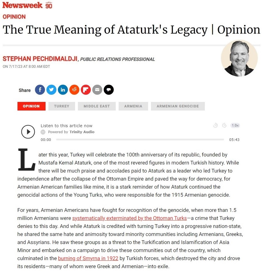 Ne Türküm ne de milliyetçiyim, ancak Stephan Pechdimaldji'nin [Peştemalcı] Newsweek'te Mustafa Kemal Atatürk aleyhinde kaleme aldığı, boş laflar ve ağır ithamlarla dolu yazı (“The True Meaning of Ataturk’s Legacy/Atatürk'ün Mirasının Gerçek Anlamı”, 17 Temmuz 2023) tarih hakkında az çok bilgisi olan, propaganda ve nefretle körleşmemiş herkesi rahatsız edecek niteliktedir. Bay Pechdimaldji'nin yazısı kimilerince palavra, daha dobra dobra konuşan kimilerince ise deli saçması olarak nitelendirilebilir.
