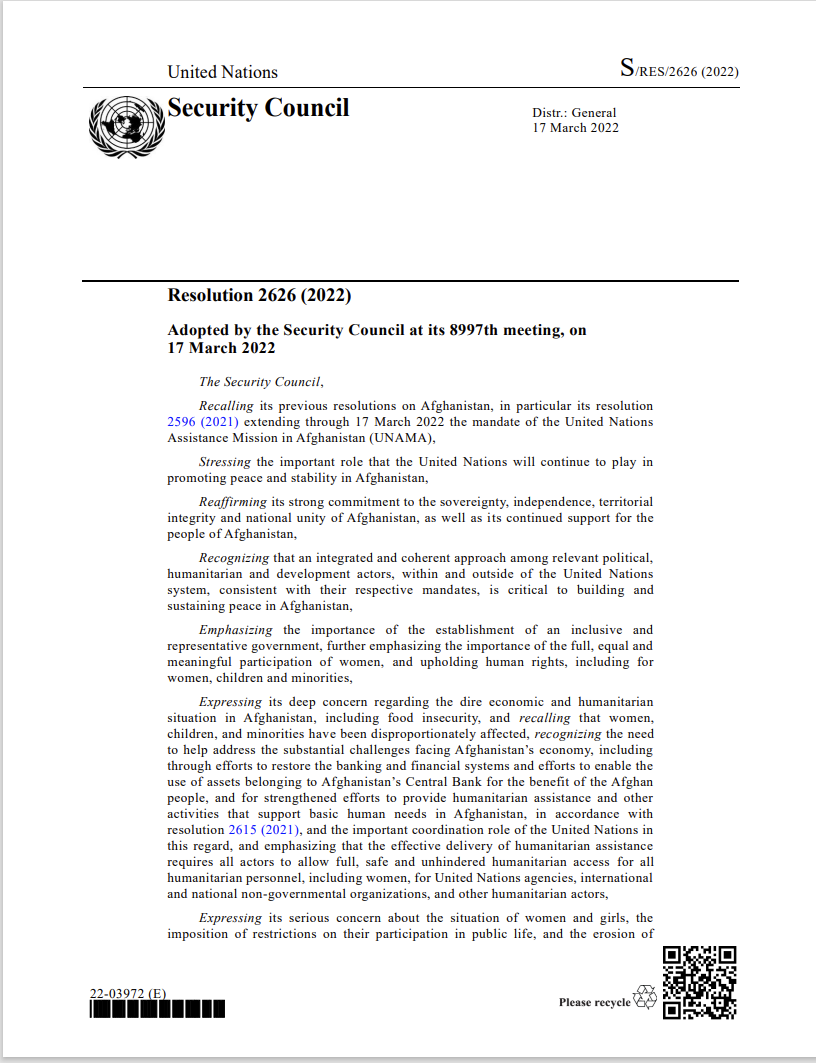 Resolution 2626 (2022) Adopted by the Security Council at its 8997th meeting, on 17 March 2022 -