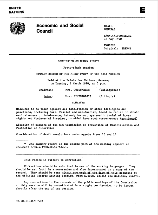 This document summarizes the proceedings of the first part of the 52nd meeting of the UN Economic and Social Council's Commission on Human Rights, held on 6 March 1990. The discussions include measures against various forms of totalitarian ideologies, protection of minorities, and specific concerns about the escalating tensions and rights issues in Azerbaijan, Armenia, and the Karabagh region.