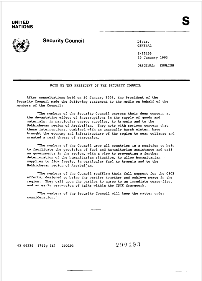Bu belge, 1993 kışı boyunca özellikle enerji olmak üzere Ermenistan ve Azerbaycan'ın Nahçıvan bölgesine yapılan malzeme ve malların tedarikinde yaşanan ciddi aksamalar hakkında Güvenlik Konseyi Başkanı tarafından yapılan bir nottur. Bu kesintilerin yerel ekonomilere ve altyapılara olan olumsuz etkilerini vurgular.