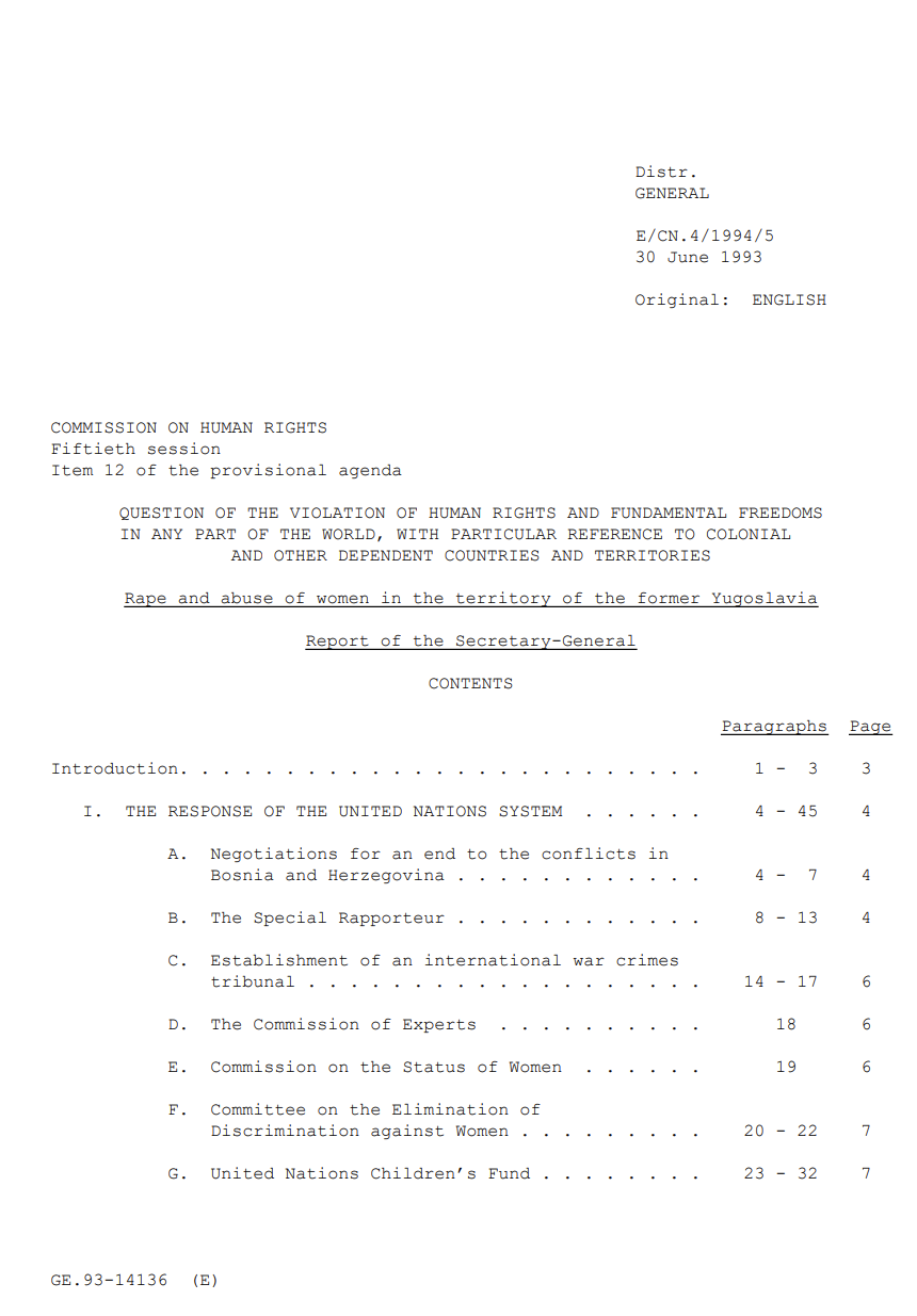 Question of the violation of human rights and fundamental freedoms in any part of the world, with particular reference to colonial and other dependent countries and territories : rape and abuse of women in the territory of the former Yugoslavia : report o