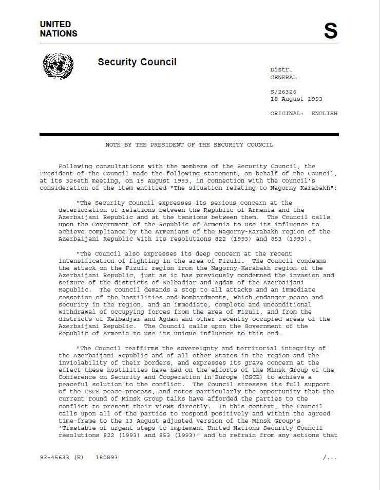 This Security Council document addresses the escalation of tensions and hostilities between Armenia and Azerbaijan, particularly concerning the Nagorny Karabakh region. It emphasizes the Security Council’s concern over the occupation of Azerbaijani territories and the impact on regional stability.