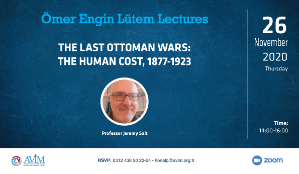 LECTURE TITLED "THE LAST OTTOMAN WARS: THE HUMAN COST, 1877-1923" We are pleased to invite you to an online lecture by Professor Jeremy Salt, a retired academic who taught courses at University of Melbourne, Bogazici University, and Bilkent University, titled “The Last Ottoman Wars: The Human Cost, 1877-1923” that will be held on 26 November 2020.