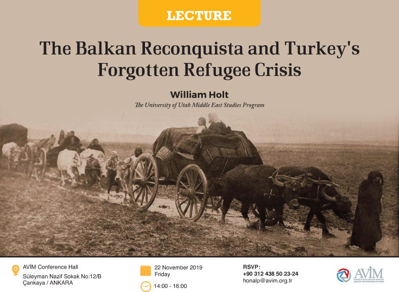 LECTURE TITLED “THE BALKAN RECONQUISTA AND TURKEY'S FORGOTTEN REFUGEE CRISIS” TO BE DELIVER BY WILLIAM H. HOLT We are pleased to invite you to a lecture by William H. Holt entitled “The Balkan Reconquista and Turkey’s Forgotten Refugee Crisis” that will be held on 22 November 2019 between 14.00-16.00 hours at the AVİM Conference Hall.