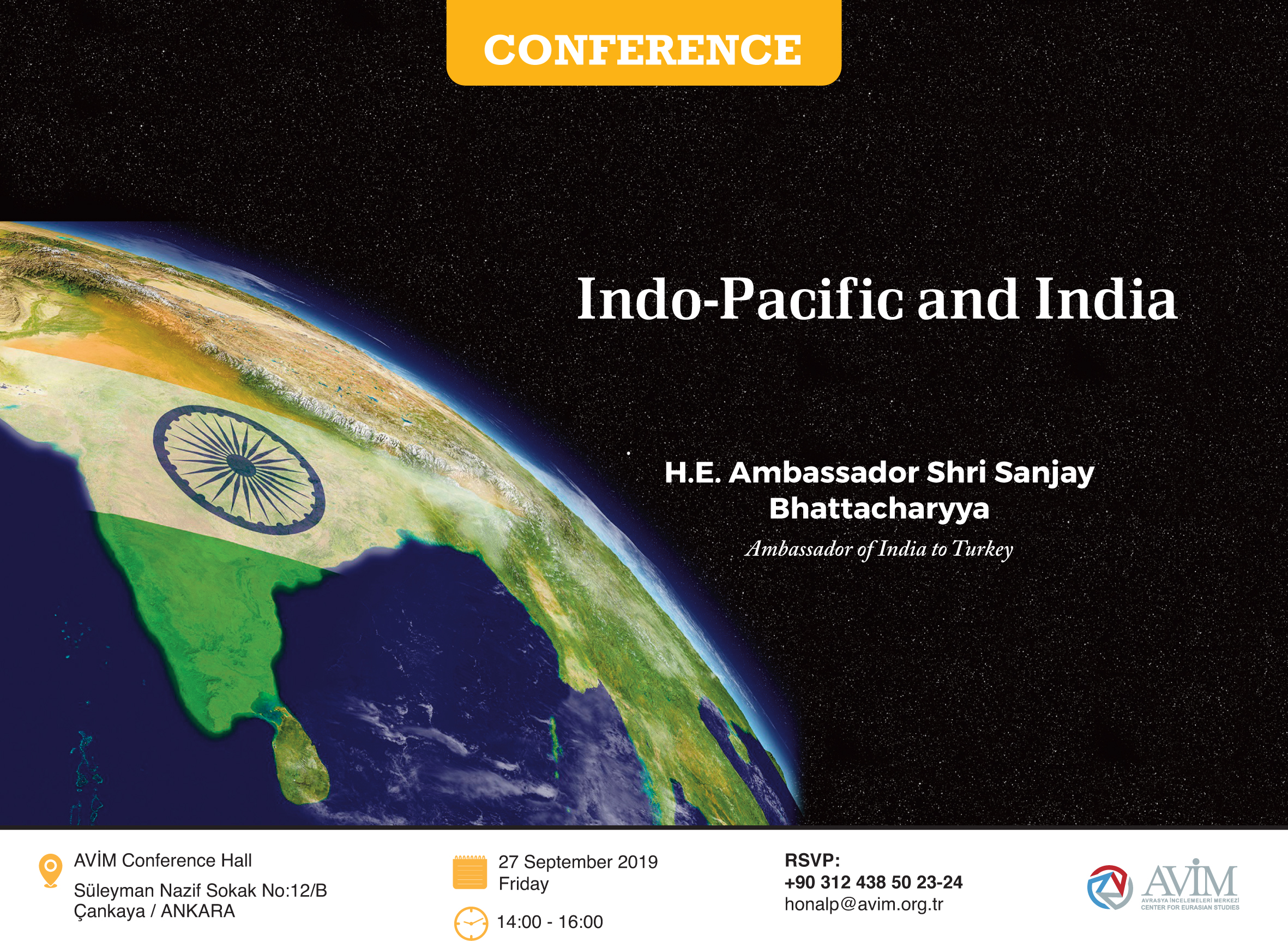 CONFERENCE TITLED “INDO-PACIFIC AND INDIA” TO BE PRESENTED BY H.E. AMBASSADOR SHRI SANJAY BHATTACHARYYA, AMBASSADOR OF INDIA TO TURKEY We are pleased to invite you to a conference titled “Indo-Pacific and India” that will be held on 27 September 2019 between 14:00-16:00 hours at the AVİM Conference Hall.