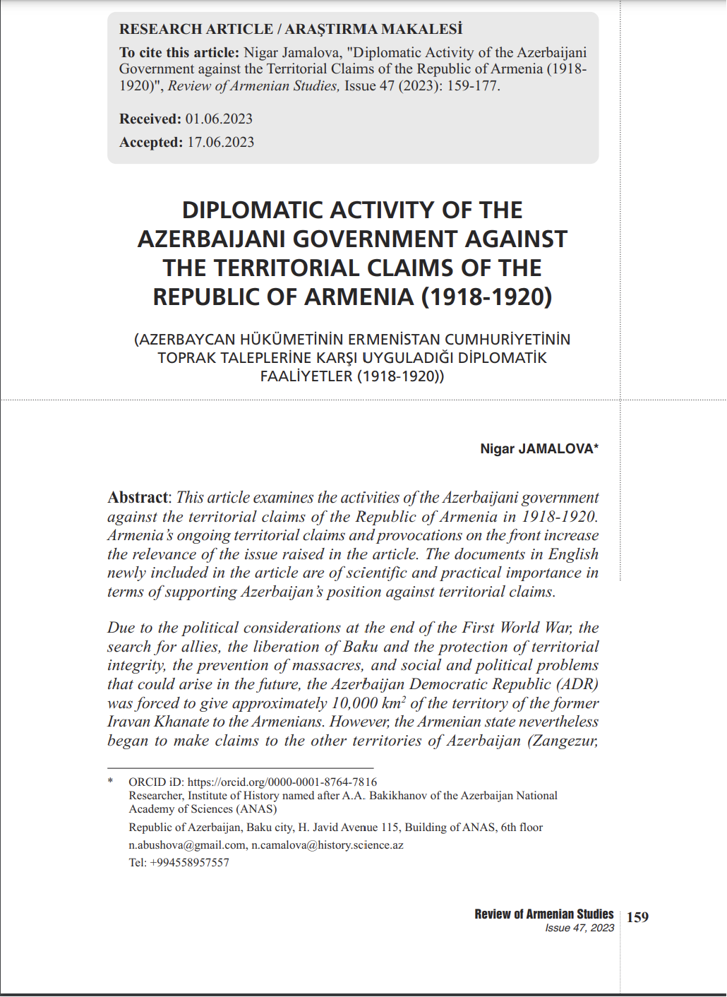 DIPLOMATIC ACTIVITY OF THE AZERBAIJANI GOVERNMENT AGAINST THE TERRITORIAL CLAIMS OF THE REPUBLIC OF ARMENIA (1918-1920)