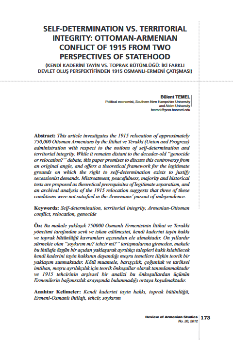 SELF-DETERMINATION VS. TERRITORIAL INTEGRITY: OTTOMAN-ARMENIAN CONFLICT OF 1915 FROM TWO PERSPECTIVES OF STATEHOOD -