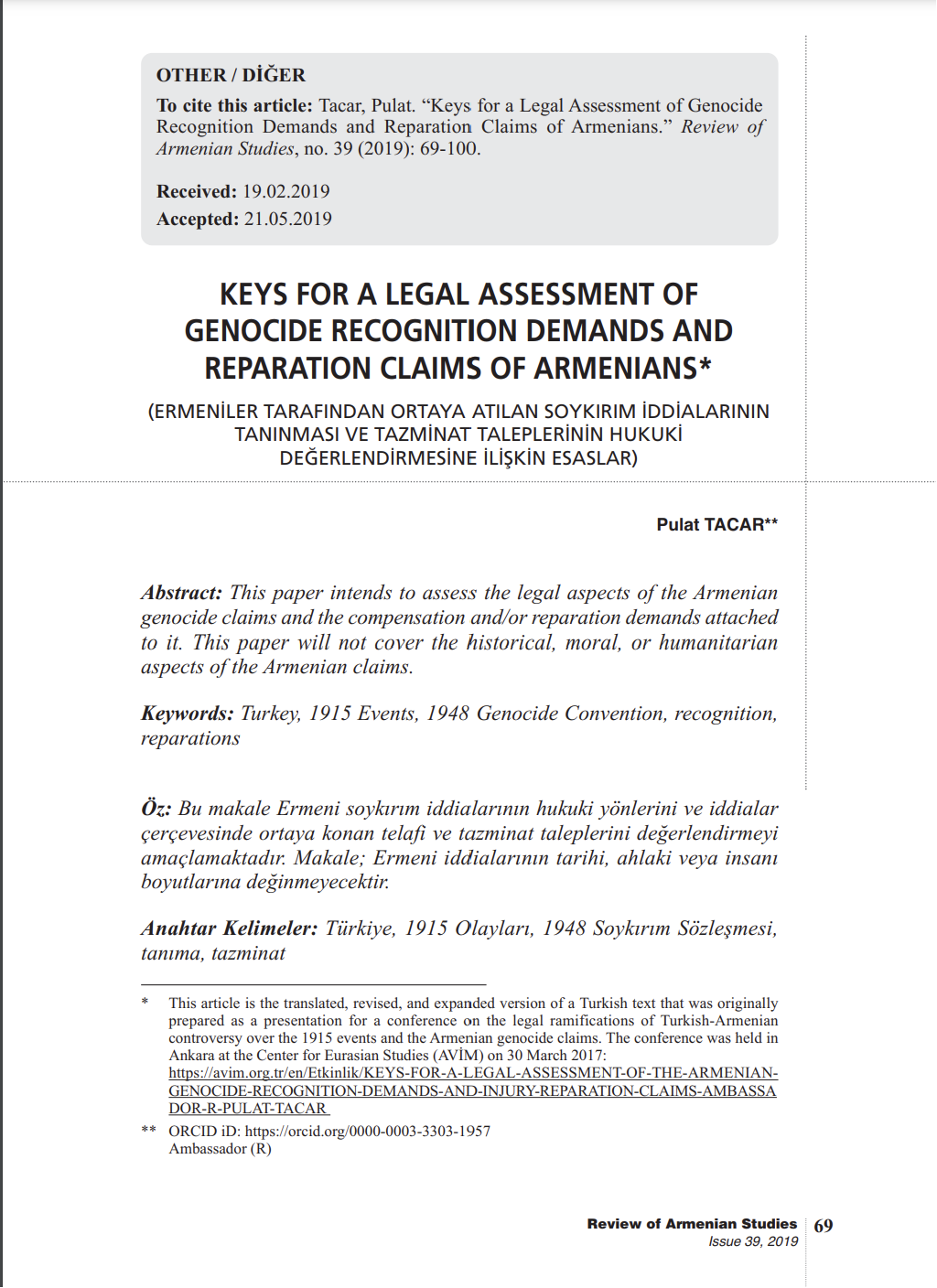 KEYS FOR A LEGAL ASSESSMENT OF GENOCIDE RECOGNITION DEMANDS AND REPARATION CLAIMS OF ARMENIANS -