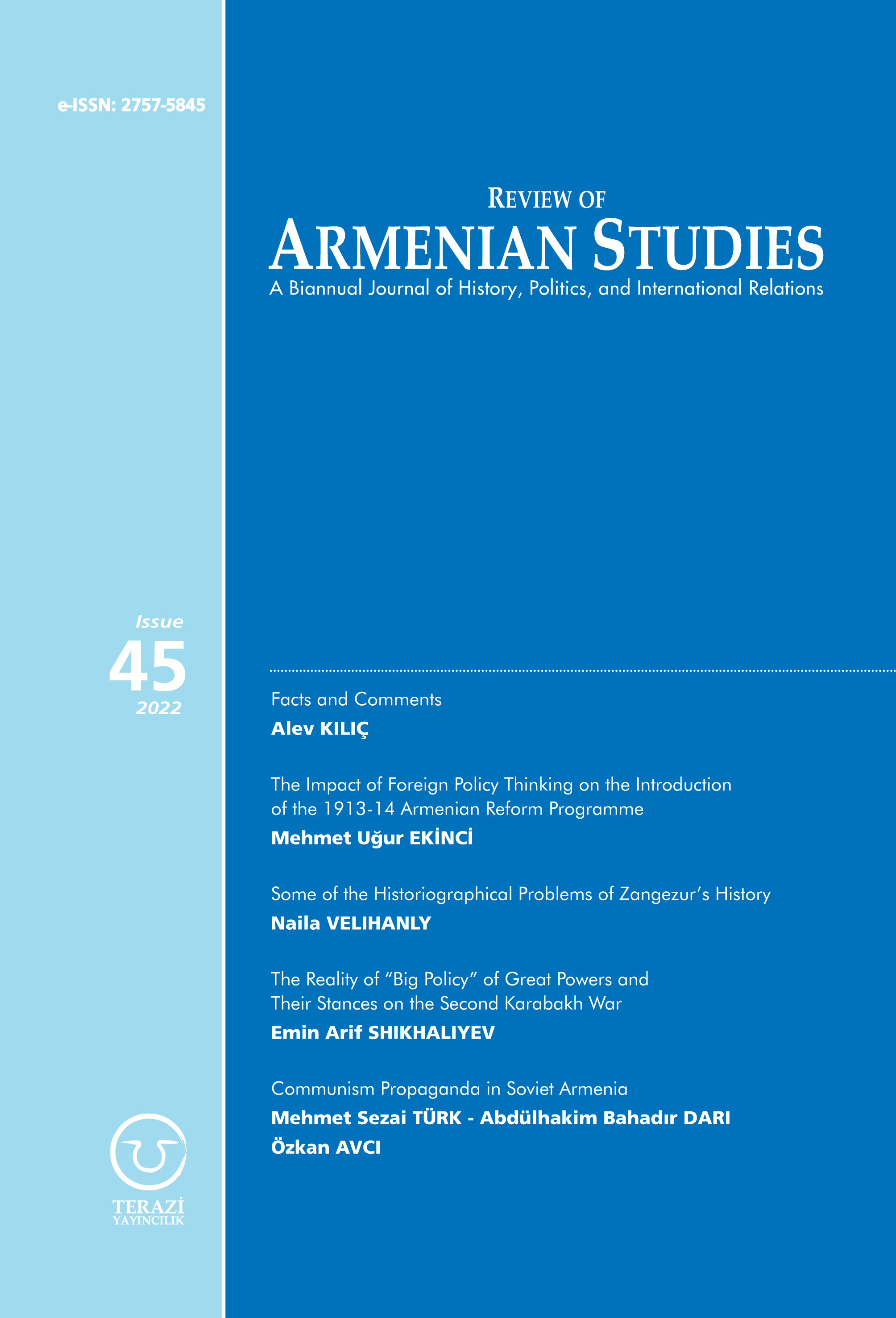 Articles submitted for publication are subject to peer review. The journal’s language is English. Review of Armenian Studies (RAS) accepts academic research that has not been previously submitted to another journal for publication. Submissions must be written in accordance with the standards put forward by the journal, and with a clear and concise language. The journal uses the latest edition of Chicago Manual of Style (full note) as its citation style. Please refer to Chicago Manual of Style official website for further details regarding proper citation methods (www.chicagomanualofstyle.org). RAS recommends the use of automated citation platforms such as “Zotero” or “Citation Machine” to make citation faster and easier for the authors.