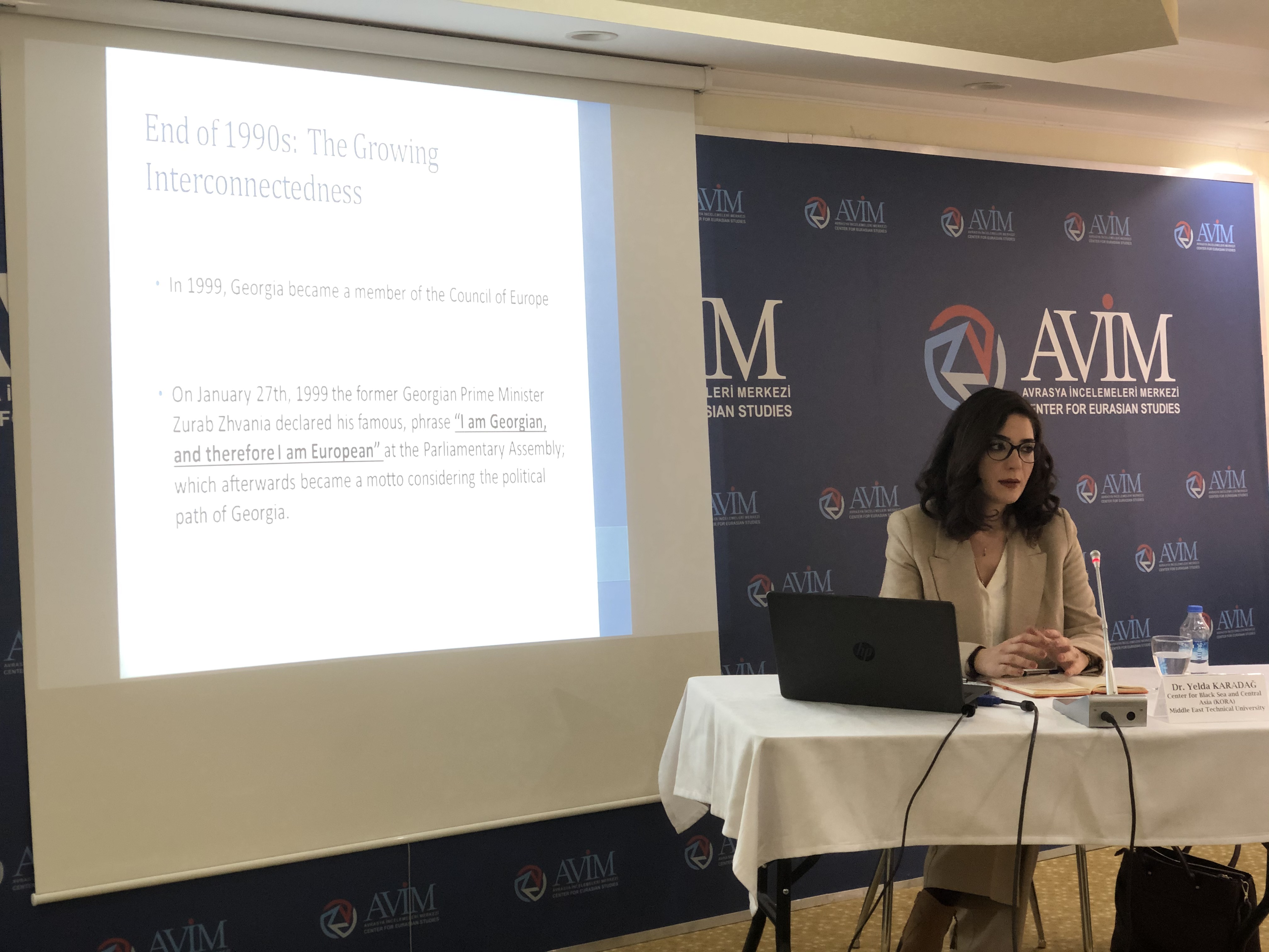 14 Ocak 2020 tarihinde AVİM’de, Orta Doğu Teknik Üniversitesi (ODTÜ) Karadeniz ve Orta Asya Ülkeleri Araştırma Merkezi’nde (KORA) doktora sonrası araştırmacı olarak çalışmalarına devam eden Dr. Yelda Karadağ’ın konuşmacı olduğu “Democratization and Europeanization in Georgia: A Path towards Democracy?” (Gürcistan’da Demokratikleşme ve Avrupalılaşma: Demokrasiye Giden Yol?) başlıklı bir konferans gerçekleştirildi. Dr. Karadağ, 1991’den bu yana Gürcistan’da demokratikleşme ve Avrupalılaşma arasındaki ilişkileri irdelediği konuşmasında, Gürcistan’ın Avrupalılaşmasının ülkedeki demokratikleşme sürecini ne ölçüde destekleyebileceği ve günümüzde hız kesmiş görünen bu süreçle ilgili önemli dönemeçler hakkındaki görüşlerini dinleyicilerle paylaşmıştır.