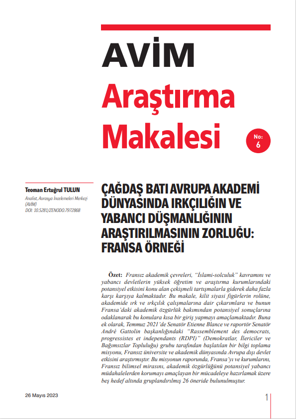 Fransız akademik çevreleri, “İslami-solculuk” kavramını ve yabancı devletlerin yüksek öğretim ve araştırma kurumlarındaki potansiyel etkisini konu alan çekişmeli tartışmalarla giderek daha fazla karşı karşıya kalmaktadır. Bu makale, kilit siyasi figürlerin rolüne, akademide ırk ve ırkçılık çalışmalarına dair çıkarımlara ve bunun Fransa’daki akademik özgürlük bakımından potansiyel sonuçlarına odaklanarak bu konulara kısa bir giriş yapmayı amaçlamaktadır. Buna ek olarak, Temmuz 2021’de Senatör Etienne Blance ve raportör Senatör André Gattolin başkanlığındaki “Rassemblement des democrats, progressistes et independants (RDPI)” (Demokratlar, İlericiler ve Bağımsızlar Topluluğu) grubu tarafından başlatılan bir bilgi toplama misyonu, Fransız üniversite ve akademik dünyasında Avrupa dışı devlet etkisini araştırmıştır. Bu misyonun raporunda, Fransa’yı ve kurumlarını, Fransız bilimsel mirasını, akademik özgürlüğünü potansiyel yabancı müdahalelerden korumayı amaçlayan bir mücadeleye hazırlamak üzere beş hedef altında gruplandırılmış 26 öneride bulunulmuşturFransız akademik çevreleri, “İslami-solculuk” kavramını ve yabancı devletlerin yüksek öğretim ve araştırma kurumlarındaki potansiyel etkisini konu alan çekişmeli tartışmalarla giderek daha fazla karşı karşıya kalmaktadır. Bu makale, kilit siyasi figürlerin rolüne, akademide ırk ve ırkçılık çalışmalarına dair çıkarımlara ve bunun Fransa’daki akademik özgürlük bakımından potansiyel sonuçlarına odaklanarak bu konulara kısa bir giriş yapmayı amaçlamaktadır. Buna ek olarak, Temmuz 2021’de Senatör Etienne Blance ve raportör Senatör André Gattolin başkanlığındaki “Rassemblement des democrats, progressistes et independants (RDPI)” (Demokratlar, İlericiler ve Bağımsızlar Topluluğu) grubu tarafından başlatılan bir bilgi toplama misyonu, Fransız üniversite ve akademik dünyasında Avrupa dışı devlet etkisini araştırmıştır. Bu misyonun raporunda, Fransa’yı ve kurumlarını, Fransız bilimsel mirasını, akademik özgürlüğünü potansiyel yabancı müdahalelerden korumayı amaçlayan bir mücadeleye hazırlamak üzere beş hedef altında gruplandırılmış 26 öneride bulunulmuşturFransız akademik çevreleri, “İslami-solculuk” kavramını ve yabancı devletlerin yüksek öğretim ve araştırma kurumlarındaki potansiyel etkisini konu alan çekişmeli tartışmalarla giderek daha fazla karşı karşıya kalmaktadır. Bu makale, kilit siyasi figürlerin rolüne, akademide ırk ve ırkçılık çalışmalarına dair çıkarımlara ve bunun Fransa’daki akademik özgürlük bakımından potansiyel sonuçlarına odaklanarak bu konulara kısa bir giriş yapmayı amaçlamaktadır. Buna ek olarak, Temmuz 2021’de Senatör Etienne Blance ve raportör Senatör André Gattolin başkanlığındaki “Rassemblement des democrats, progressistes et independants (RDPI)” (Demokratlar, İlericiler ve Bağımsızlar Topluluğu) grubu tarafından başlatılan bir bilgi toplama misyonu, Fransız üniversite ve akademik dünyasında Avrupa dışı devlet etkisini araştırmıştır. Bu misyonun raporunda, Fransa’yı ve kurumlarını, Fransız bilimsel mirasını, akademik özgürlüğünü potansiyel yabancı müdahalelerden korumayı amaçlayan bir mücadeleye hazırlamak üzere beş hedef altında gruplandırılmış 26 öneride bulunulmuştur