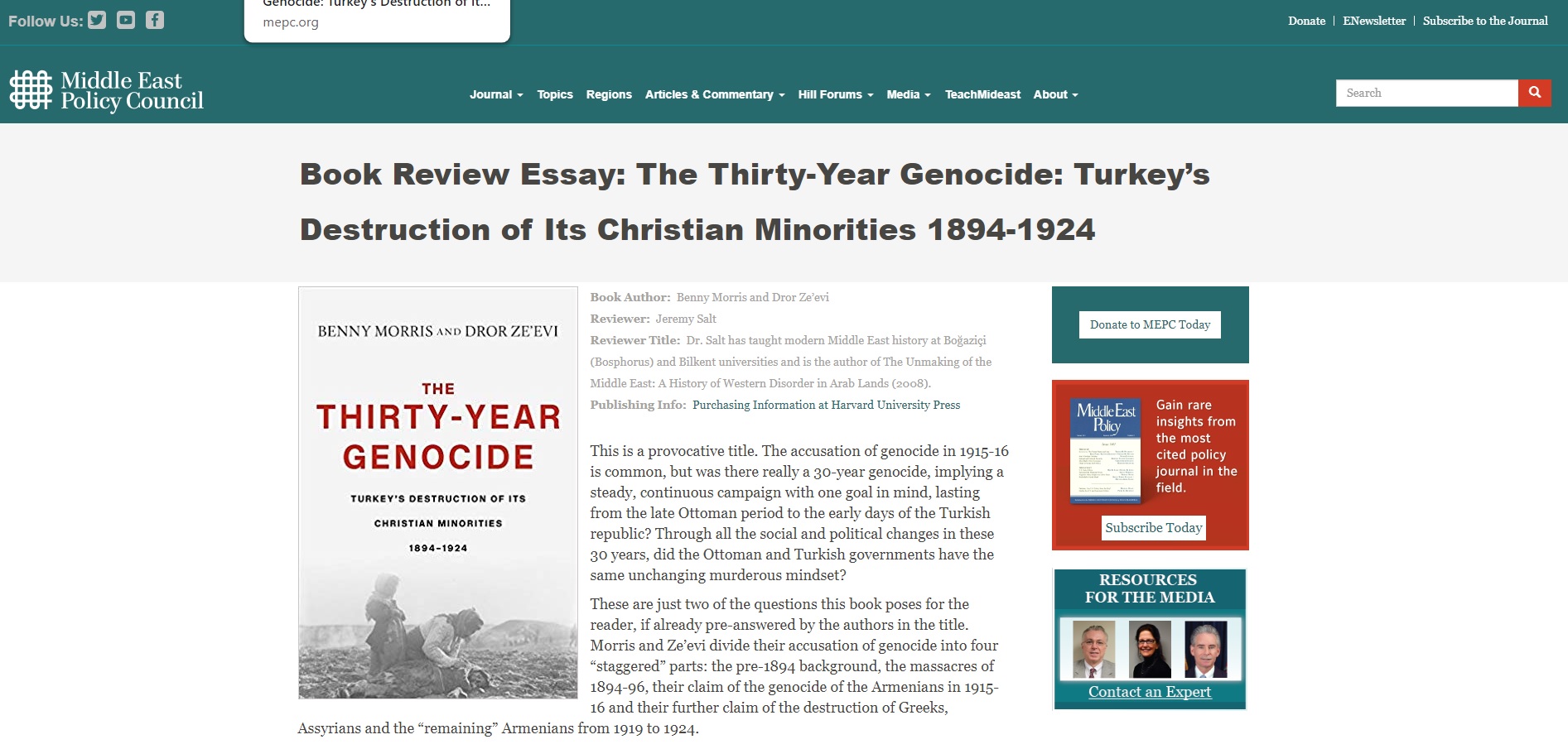 2019 yılında yayımlanan Benny Morris ve Dror Ze’evi’in yazarı oldukları “The Thirty-Year Genocide: Turkey's Destruction of Its Christian Minorities 1894–1924” başlıklı çalışmaları hakkında Jeremy Salt’ın kaleme aldığı inceleme yazısı Middle East Policy Council’in internet sayfasında yayınlanmıştır. Bu yazıya aşağıdaki adresten ulaşılabilir.