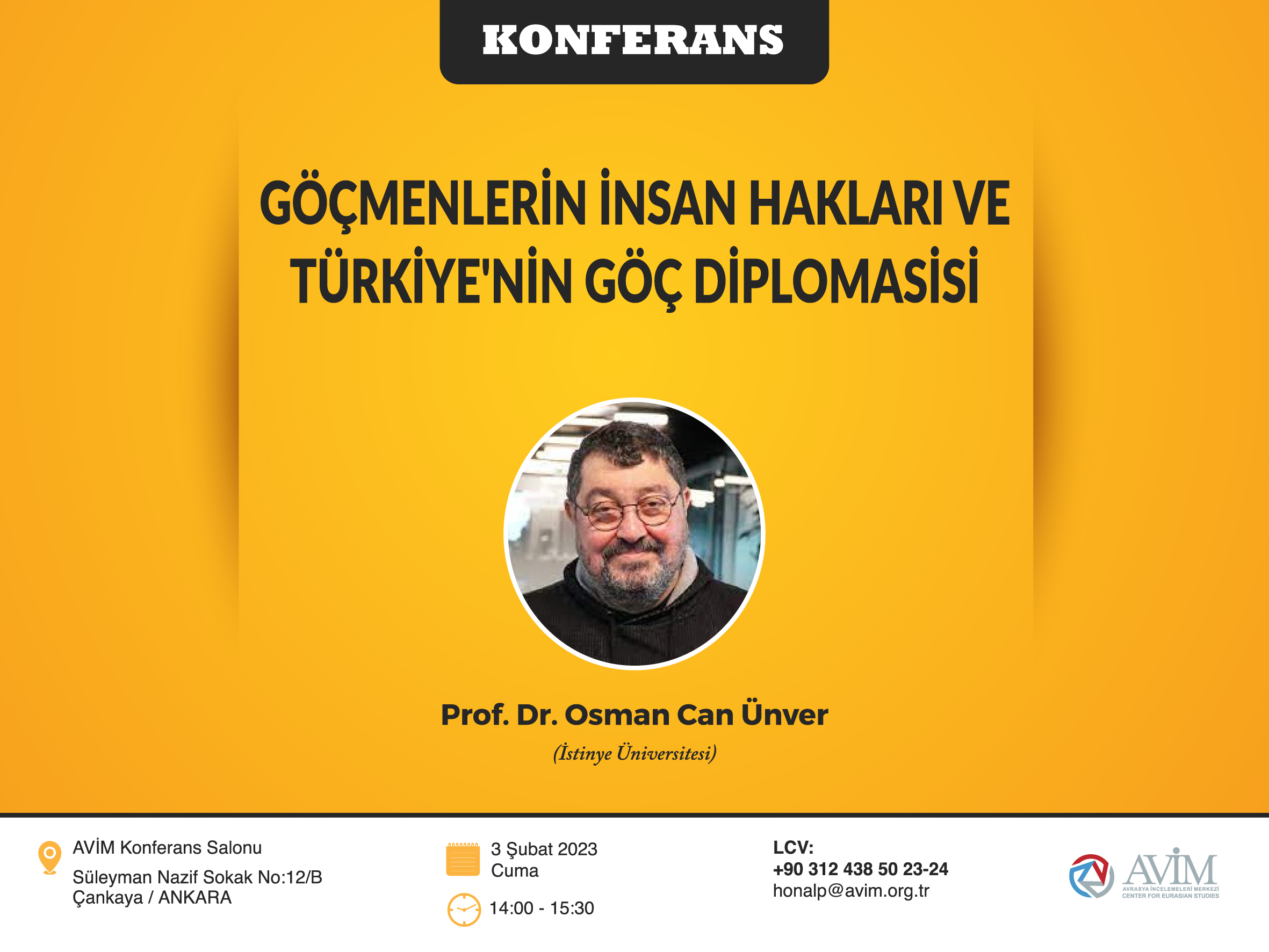 3 Şubat 2023 Cuma günü, Avrasya İncelemeleri Merkezi (AVİM), Prof. Dr. Osman Can Ünver’in konuşmacı olacağı “Göçmenlerin İnsan Hakları ve Türkiye’nin Göç Diplomasisi” başlıklı bir konferans düzenlemektedir.