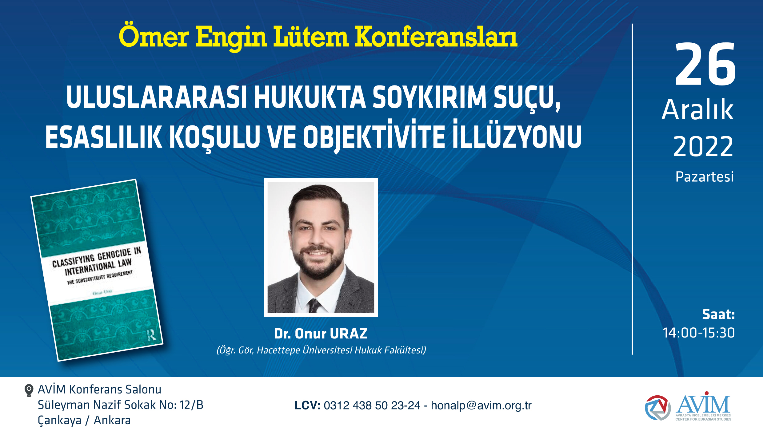 2022 yılı Ömer Engin Lütem Konferansları'nın dokuzuncusu, Dr. Öğr. Gör. Onur Uraz’ın konuşmacı olduğu “Uluslararası Hukukta Soykırım Suçu, Esaslılık Koşulu ve Objektivite İllüzyonu” başlıklı konferans 26 Aralık 2022 Pazartesi günü gerçekleşmiştir.