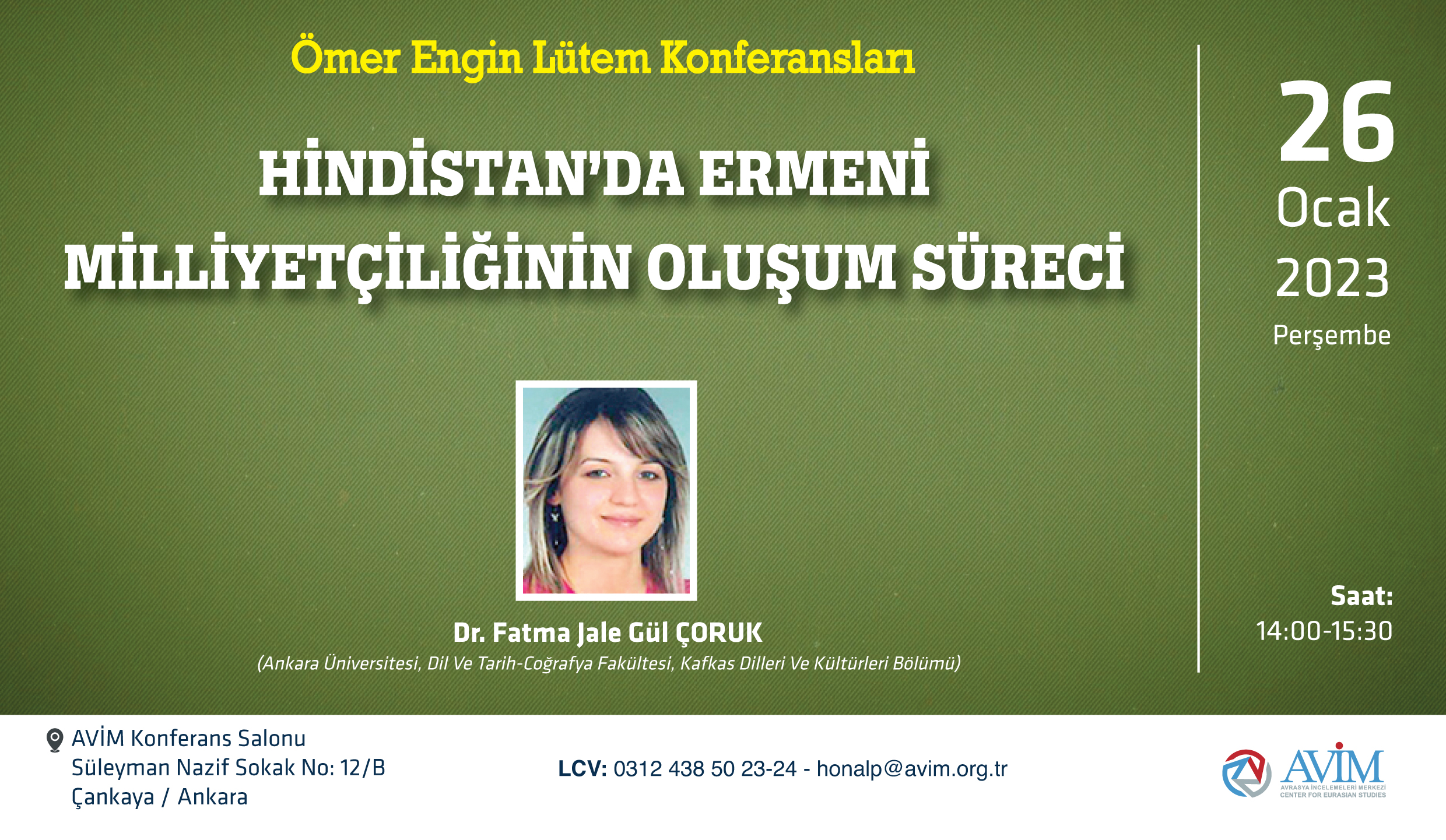 2023 yılı Ömer Engin Lütem Konferansları'nın ilki, Arş. Gör. Dr. Fatma Jale Gül Çoruk’un konuşmacı olduğu “Hindistan’da Ermeni Milliyetçiliğinin Oluşum Süreci” başlıklı konferansla 26 Ocak 2023 Perşembe günü gerçekleşmiştir.