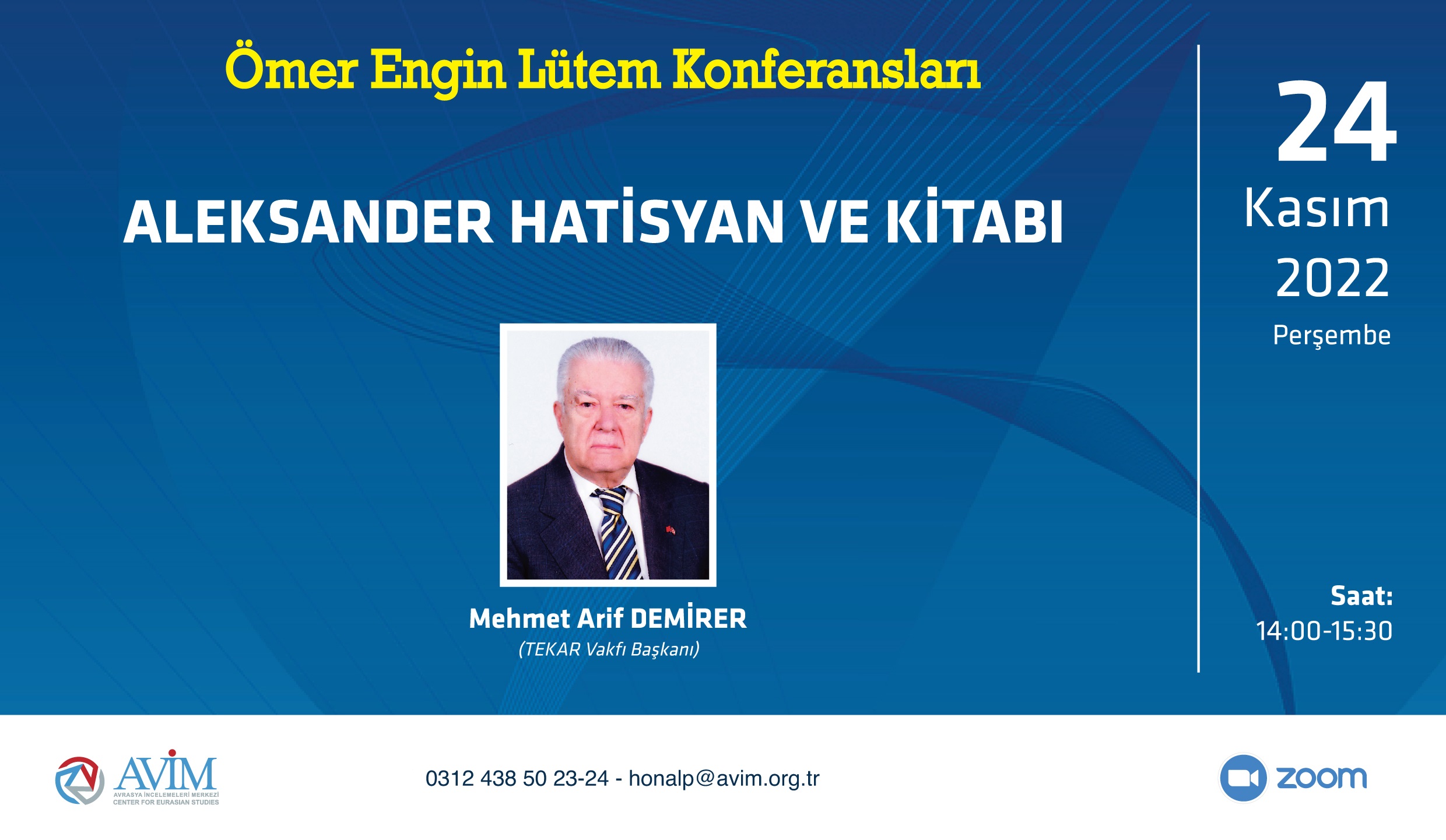 2022 yılı Ömer Engin Lütem Konferansları'nın sekizincisi 24 Kasım 2022 Perşembe günü, Mehmet Arif Demirer’in konuşmacı olacağı “Aleksander Hatisyan ve Kitabı” başlıklı konferansla devam edecektir.