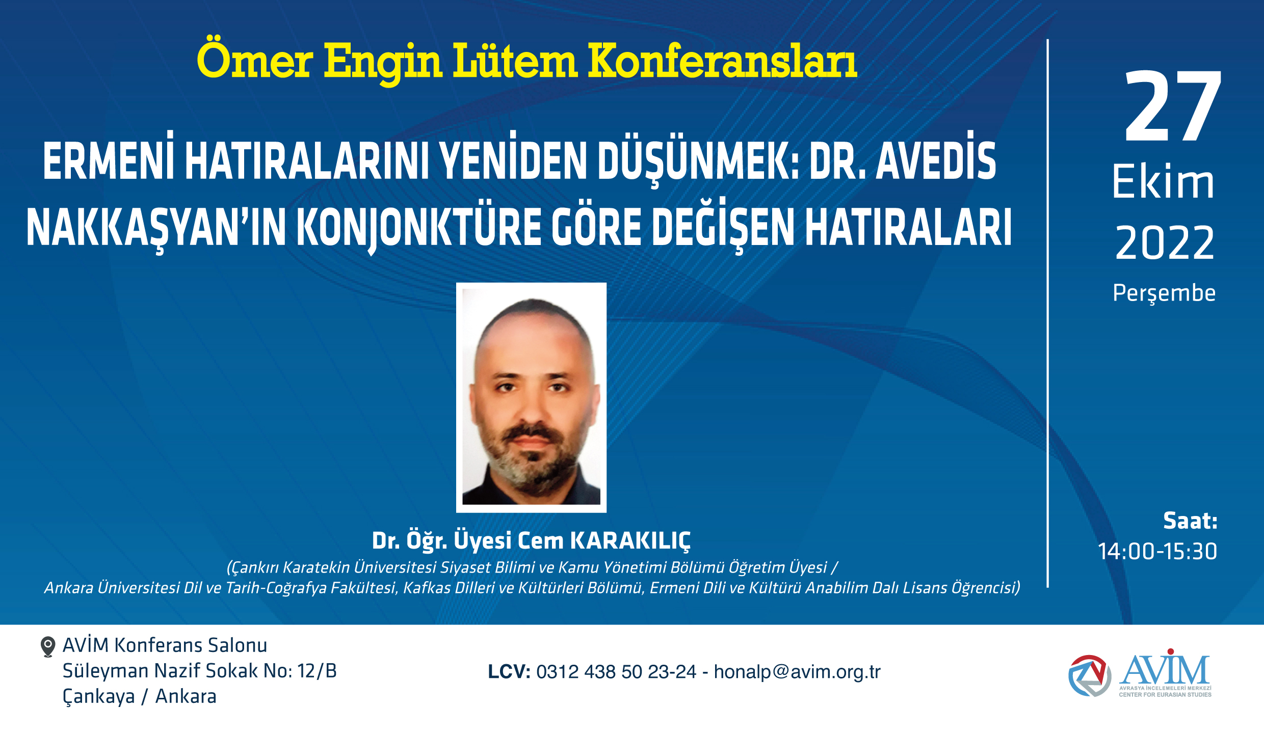 2022 yılı Ömer Engin Lütem Konferansları'nın yedincisi, Dr. Öğr. Üyesi Cem Karakılıç’ın konuşmacı olduğu "Ermeni Hatıralarını Yeniden Düşünmek: Dr. Avedis Nakkaşyan’ın Konjonktüre Göre Değişen Hatıraları" başlıklı konferans 27 Ekim 2022 Perşembe günü gerçekleşmiştir.