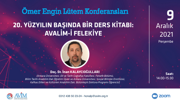 2021 yılı Ömer Engin Lütem Konferansları'nın on birincisi, 9 Aralık 2021 Perşembe günü, Doç. Dr. İnan Kalaycıoğulları’nın konuşmacı olacağı “20. Yüzyılın Başında Bir Ders Kitabı: Avalim-i Felekiye" başlıklı konferansla devam edecektir.