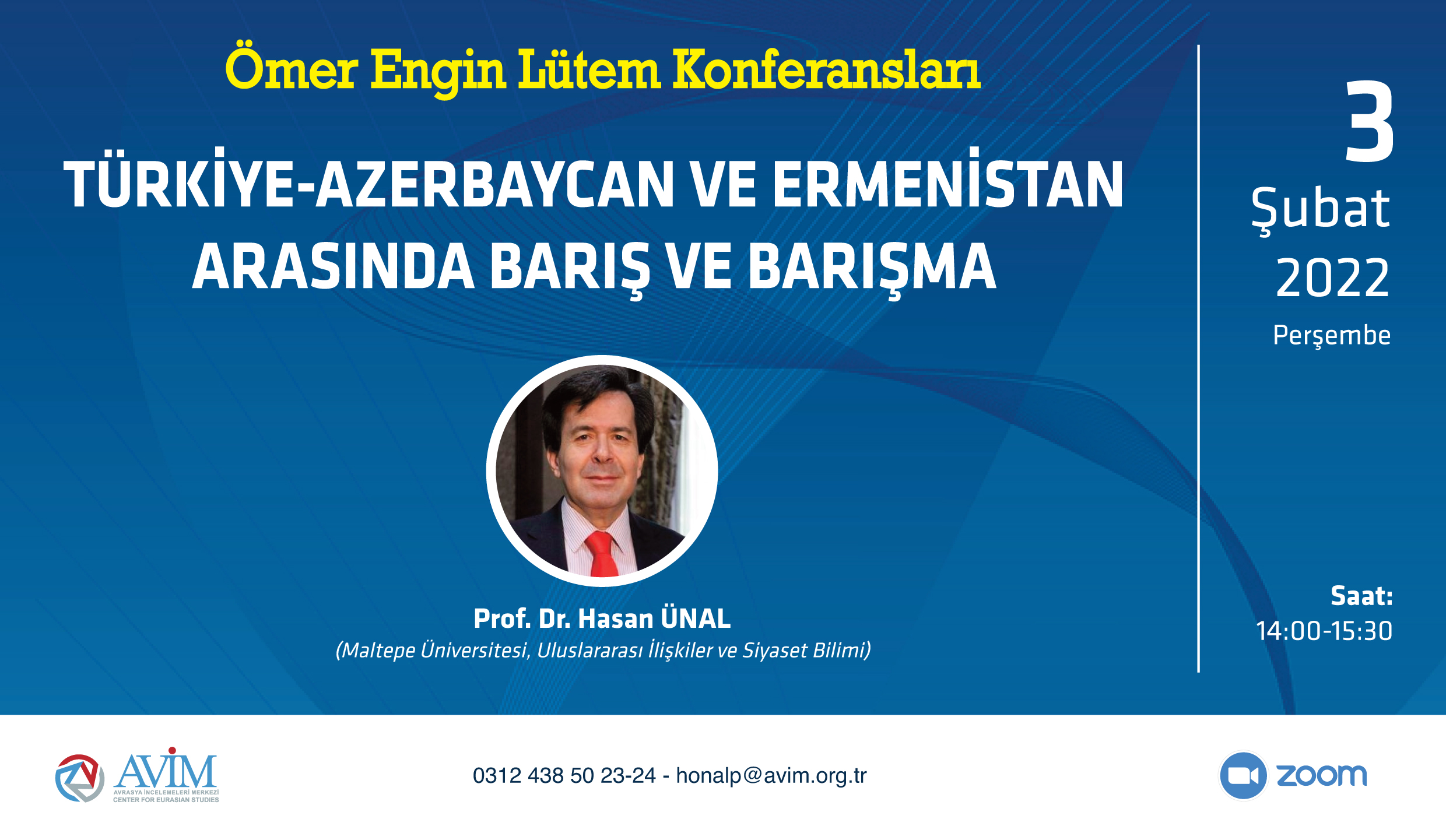 2022 yılı Ömer Engin Lütem Konferansları'nın ikincisi, Prof. Dr. Hasan Ünal’ın konuşmacı olduğu “Türkiye-Azerbaycan ve Ermenistan Arasında Barış ve Barışma” başlıklı konferans 3 Şubat 2022 Perşembe günü gerçekleşmiştir.