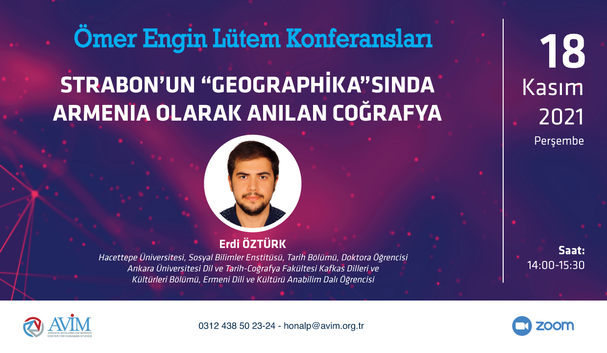 2021 yılı Ömer Engin Lütem Konferansları'nın onuncusu, 18 Kasım 2021 Perşembe günü, Hacettepe Üniversitesi, Sosyal Bilimler Enstitüsü, Tarih Bölümü, Doktora Öğrencisi Erdi Öztürk’ün konuşmacı olarak yer aldığı “Strabon’un Geographikasında Armenia Olarak Anılan Coğrafya” başlıklı konferans 18 Kasım 2021 Perşembe günü çevrim içi olarak gerçekleştirilmiştir.