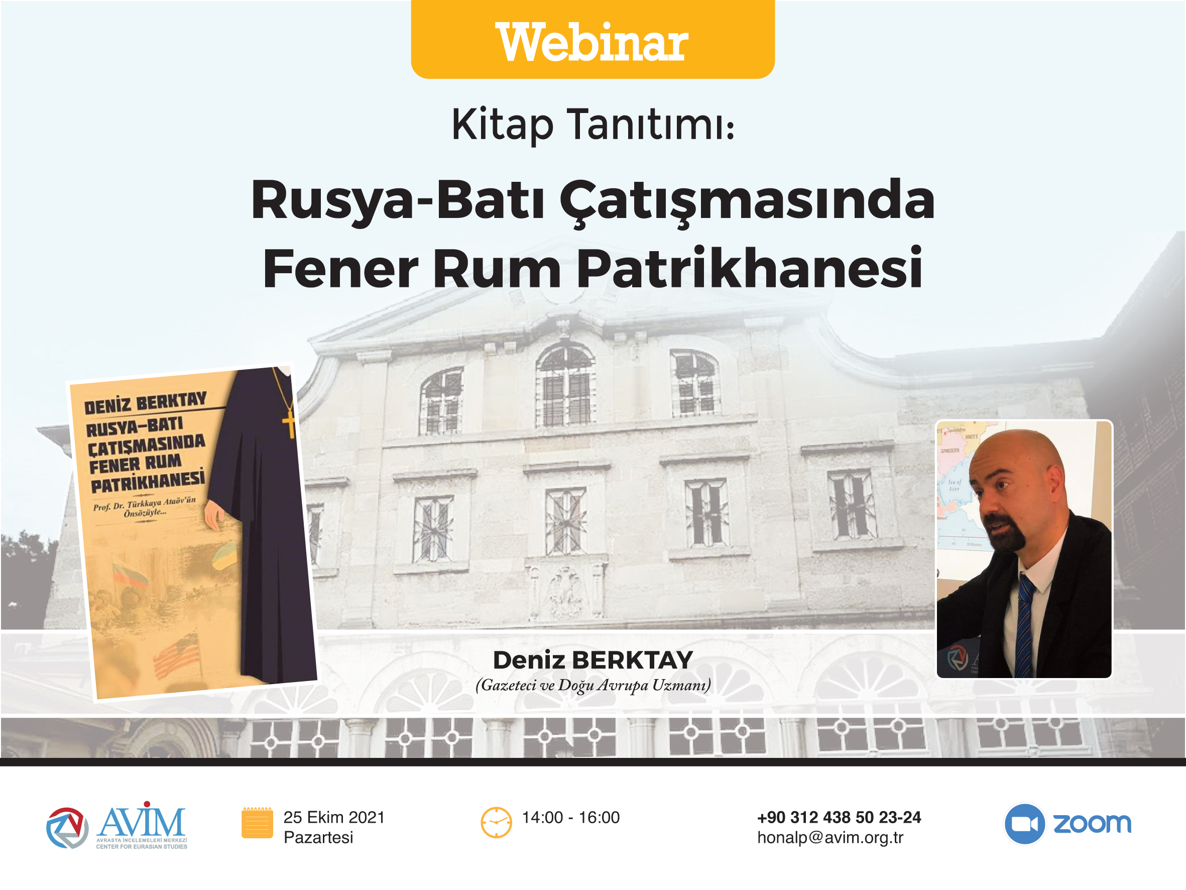 Avrasya İncelemeleri Merkezi (AVİM), 25 Ekim 2021 tarihinde, Gazeteci ve Doğu Avrupa Uzmanı Deniz Berktay’ın “Rusya-Batı Çatışmasında Fener Rum Patrikhanesi” başlıklı kitabını tanıtan bir toplantı düzenlemektedir.