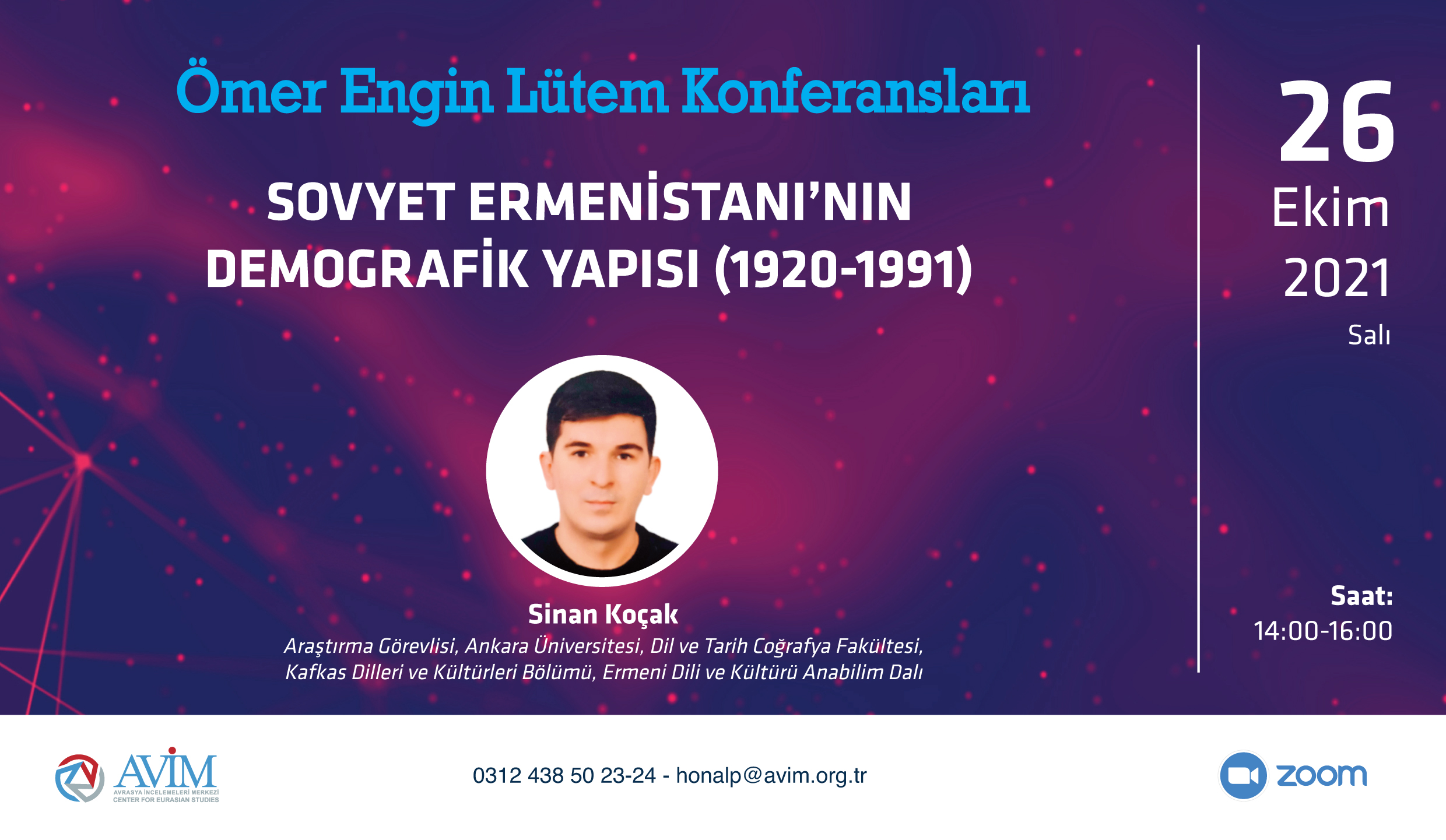 2021 yılı Ömer Engin Lütem Konferanslarının dokuzuncusu, Ankara Üniversitesi Dil Tarih ve Coğrafya Fakültesi, Kafkas Dilleri ve Kültürü Bölümü, Ermeni Dili ve Kültürü Anabilim Dalı Araştırma Görevlisi Sinan Koçak’ın konuşmacı olarak yer aldığı “Sovyet Ermenistanı’nın Demografik Yapısı (1920-1991)” başlıklı konferans 26 Ekim 2021 Salı günü çevrim içi olarak gerçekleştirilmiştir.