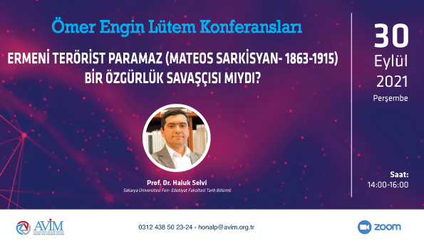 2021 yılı Ömer Engin Lütem Konferanslarının sekizincisi, Prof. Dr. Haluk Selvi’nin konuşmacı olarak yer aldığı “Ermeni Terörist Paramaz (Mateos Sarkisyan- 1863-1915) Bir Özgürlük Savaşçısı Mıydı?” başlıklı konferans 30 Eylül 2021 Perşembe günü çevrim içi olarak gerçekleştirilmiştir.