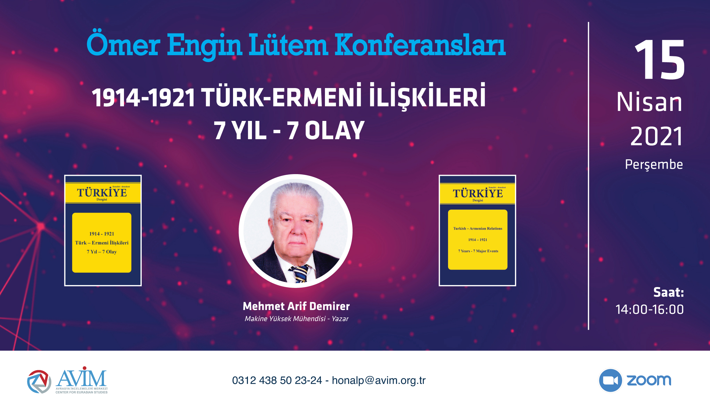 2021 yılı Ömer Engin Lütem Konferanslarının beşincisi, Makine Yüksek Mühendisi-Yazar Mehmet Arif Demirer’in konuşmacı olarak yer aldığı “1914-1921 Türk-Ermeni İlişkileri: 7 Yıl-7 Olay” başlıklı konferans 15 Nisan 2021 Perşembe günü çevrim içi olarak gerçekleştirilmiştir.