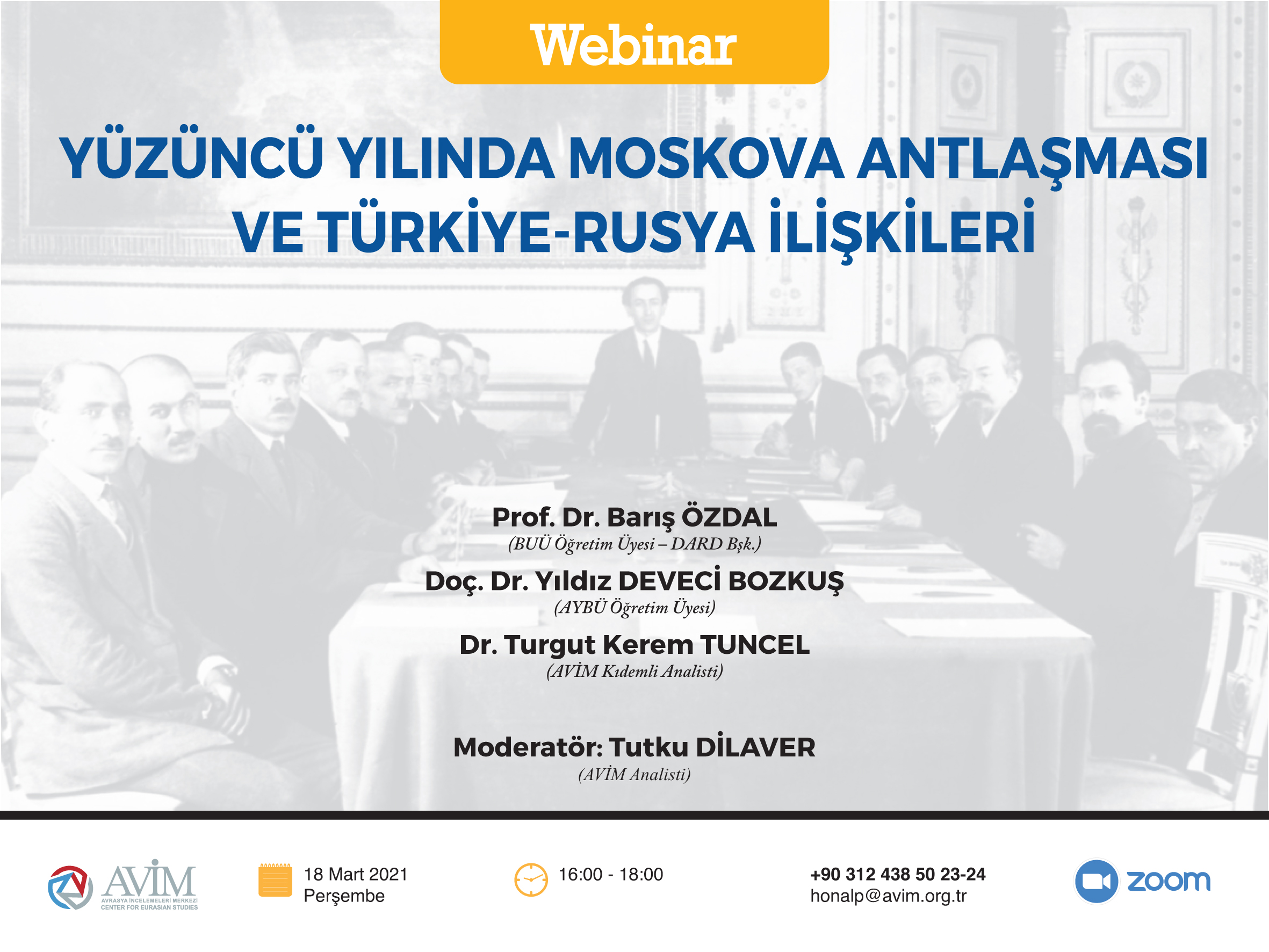 Avrasya İncelemeleri Merkezi (AVİM) “Yüzüncü Yılında Moskova Antlaşması ve Türkiye-Rusya İlişkileri” başlığıyla 18 Mart 2021, saat 16:00-18:00 tarihleri arasında bir webinar düzenlemektedir.