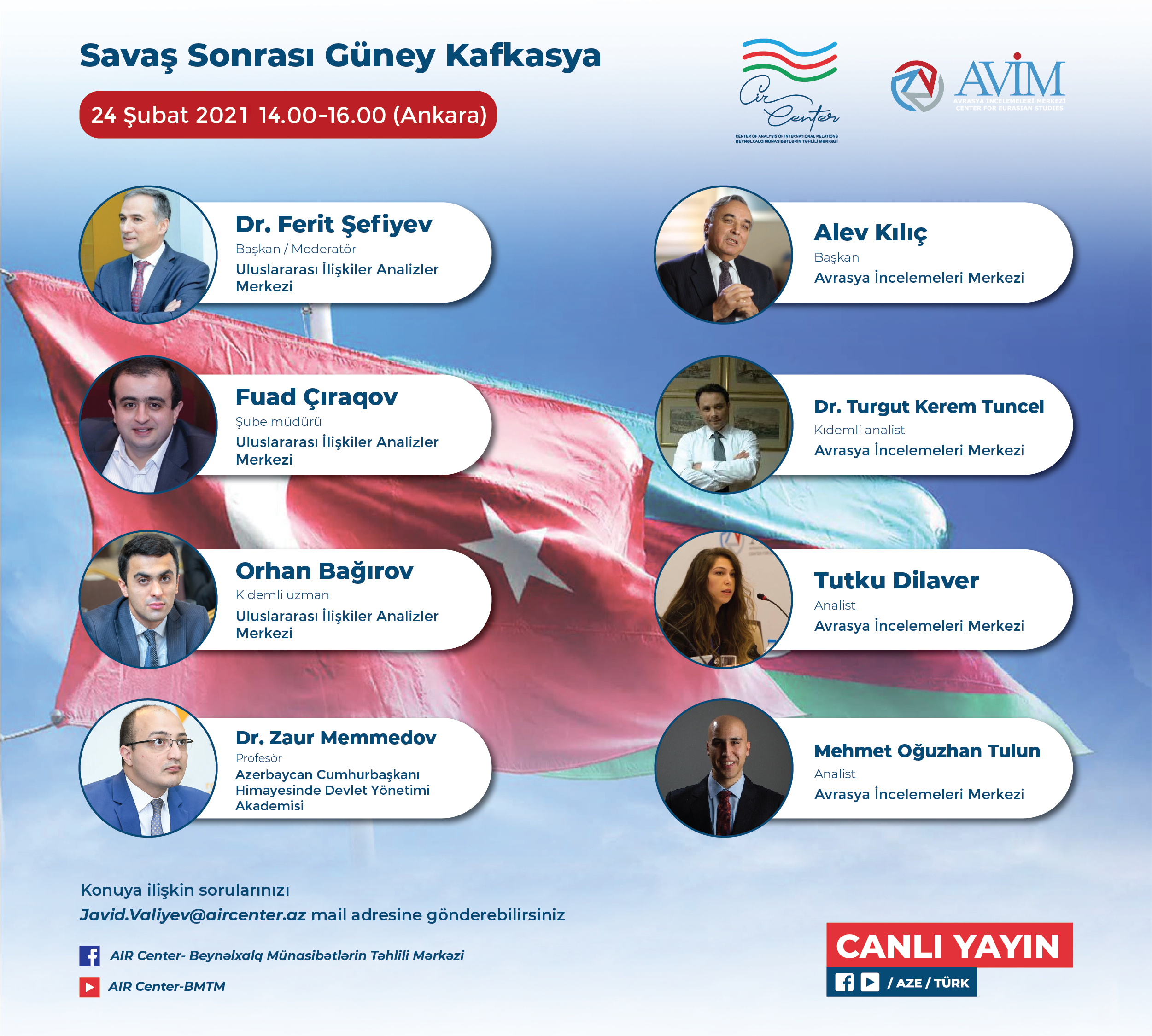 Beynəlxalq Münasibətlərin Təhlili Mərkəzi (BMTM - Uluslararası İlişkiler Analizler Merkezi, Azerbaycan) ve Avrasya İncelemeleri Merkezi (AVİM), 24 Şubat 2021 Çarşamba günü 14:00-16:00 saatlerinde, 2020 Karabağ Savaşı sonrasında Güney Kafkasya’da ortaya çıkmakta olan durumun değerlendirileceği bir webinar düzenlemektedir.