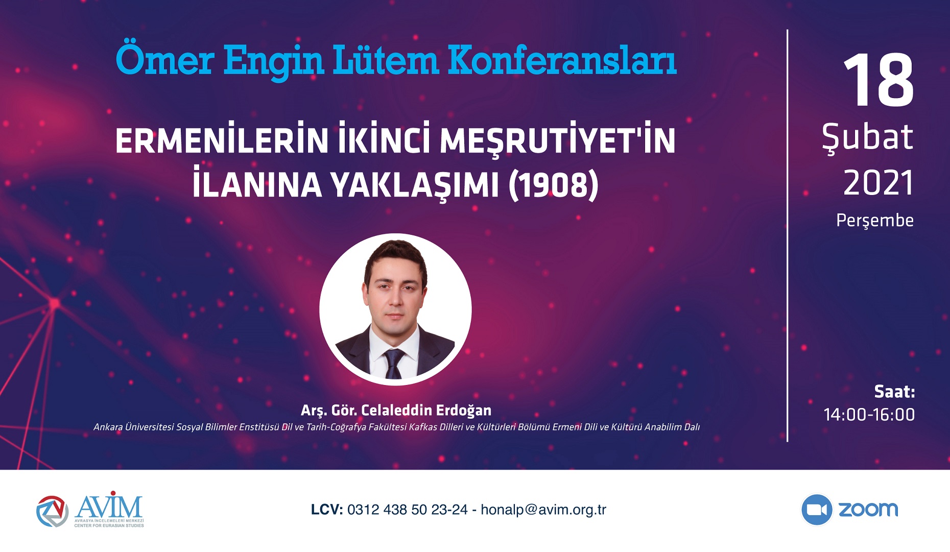 2021 yılı Ömer Engin Lütem Konferanslarının ikincisi, 18 Şubat 2021 Perşembe günü 14:00-16:00 saatleri arasında gerçekleştirilecektir. “Ermenilerin İkinci Meşrutiyet’in İlanına Yaklaşımı (1908)” başlıklı toplantıda Ankara Üniversitesi Sosyal Bilimler Enstitüsü Kafkas Dilleri ve Kültürleri Bölümü Ermeni Dili ve Kültürü Anabilim Dalı’nda doktora eğitimine devam eden Arş. Gör. Celaleddin Erdoğan konuşmacı olarak yer alacaktır.