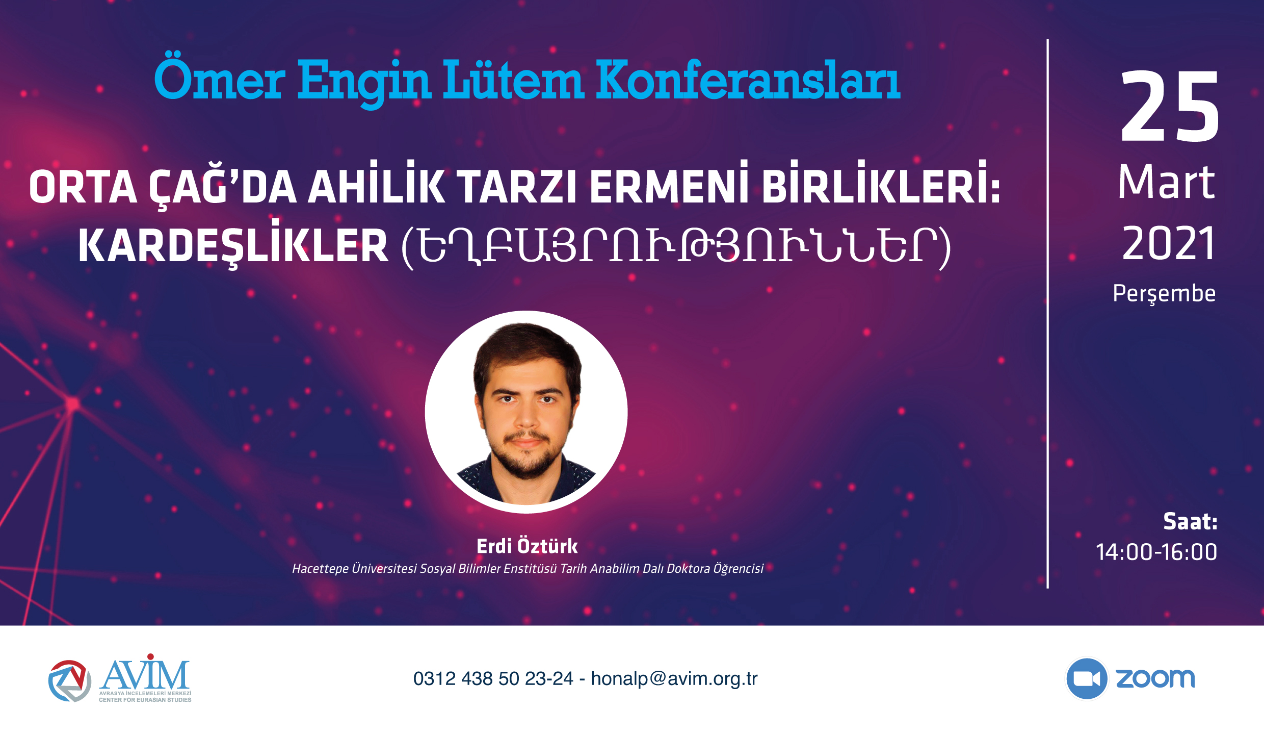 2021 yılı Ömer Engin Lütem Konferanslarının dördüncüsü, Hacettepe Üniversitesi Sosyal Bilimler Enstitüsü Tarih Anabilim Dalı Doktora öğrencisi Erdi Öztürk’ün konuşmacı olarak yer aldığı “Orta Çağ’da Ahilik Tarzı Ermeni Birlikleri: Kardeşlikler (Եղբայրություններ)” başlıklı konferans 25 Mart 2021 Perşembe günü çevrim içi olarak gerçekleştirilmiştir.