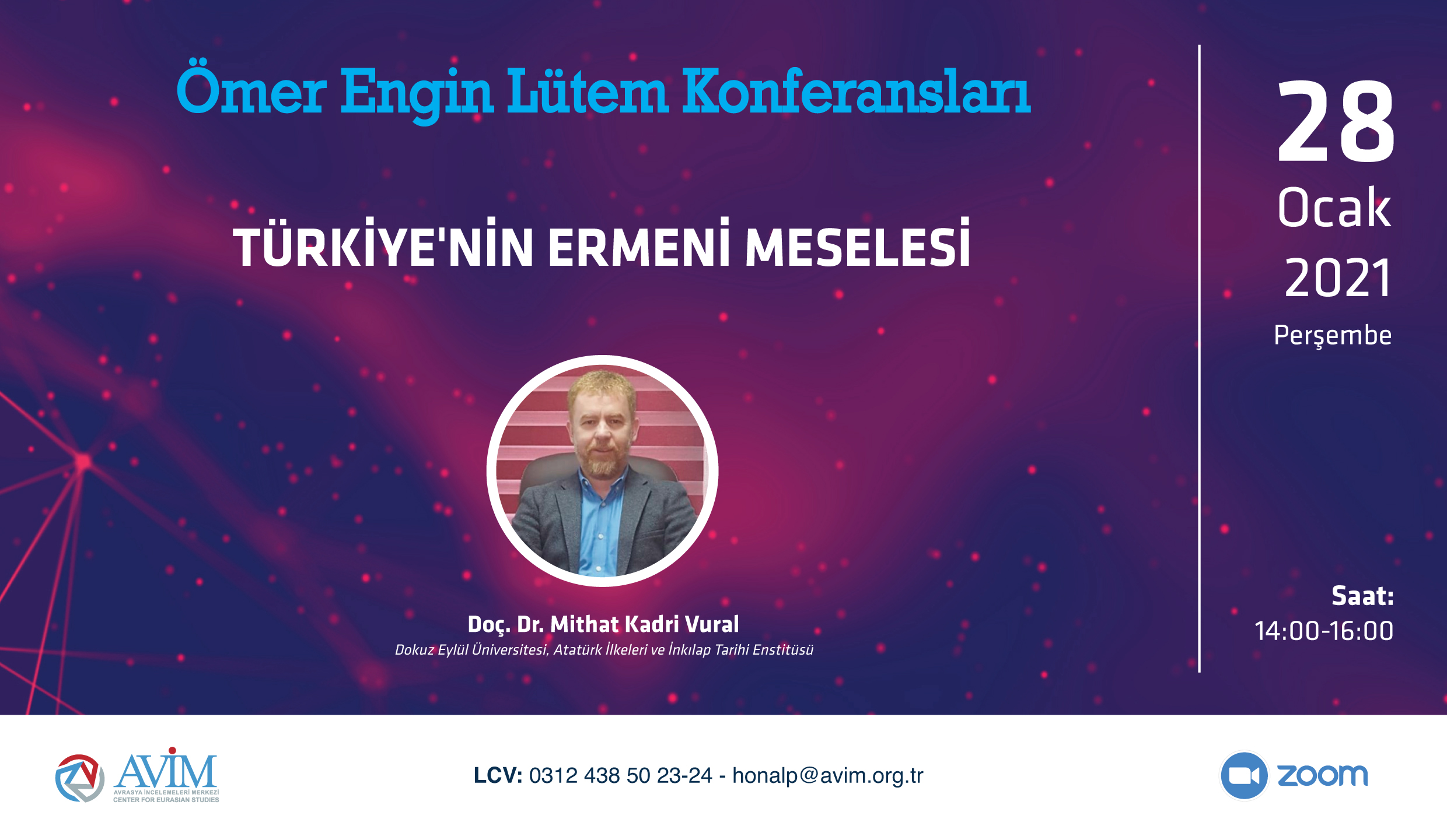 COVID-19 salgını nedeniyle 2021 yılında çevrim içi ortamda düzenlemeye devam ettiğimiz Ömer Engin Lütem Konferansları kapsamında yapılacak ilk etkinlik, 28 Ocak 2021 Perşembe günü 14:00-16:00 saatleri arasında gerçekleştirilecektir. “Türkiye’nin Ermeni Meselesi” başlıklı toplantıda Dokuz Eylül Üniversitesi Atatürk İlkeleri ve İnkılap Tarihi Enstitüsü’nden Doç. Dr. Mithat Kadri Vural konuşmacı olarak yer alacaktır.