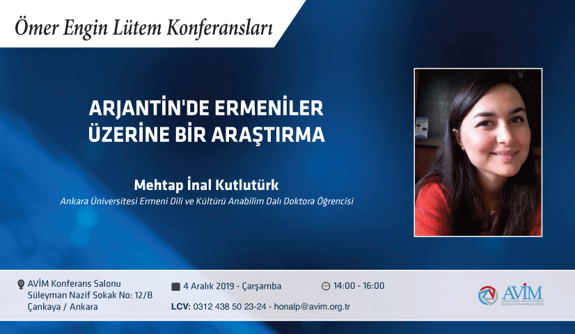 2019 yılı Ömer Engin Lütem Konferansları’nın dokuzuncusu, 4 Aralık 2019 Çarşamba günü Ankara Üniversitesi Sosyal Bilimler Enstitüsü Ermeni Dili ve Kültürü Anabilim Dalı Doktora Öğrencisi Mehtap İnal Kutlutürk’ün konuşmacı olacağı “Arjantin’de Ermeniler Üzerine Bir Araştırma” başlıklı konferansla devam edecektir.