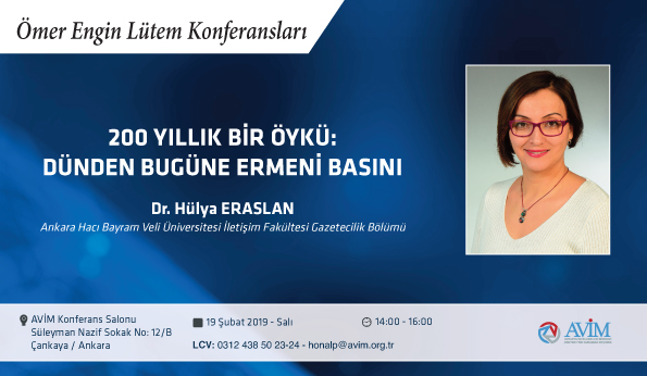 19 Şubat 2019 Salı günü, 2019 yılı Ömer Engin Lütem Konferansları’nın ikincisinde Ankara Hacı Bayram Veli Üniversitesi İletişim Fakültesi Gazetecilik Bölümü Araştırma Görevlisi Dr. Hülya Eraslan “200 Yıllık Bir Öykü: Dünden Bugüne Ermeni Basını” başlıklı bir sunum gerçekleştirecektir.