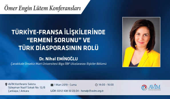 1 Mart 2019 Cuma günü, Çanakkale Onsekiz Mart Üniversitesi Biga İİBF Uluslararası İlişkiler Bölümü Öğretim Üyesi Dr. Nihal Eminoğlu’nun konuşmacı olduğu “Türkiye-Fransa İlişkilerinde ‘Ermeni Sorunu’ ve Türk Diasporasının Rolü” başlıklı konferans AVİM’de gerçekleştirildi.
