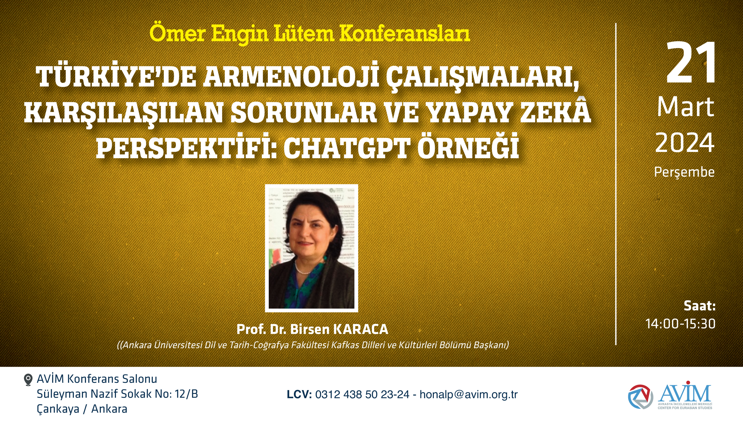 2024 yılı Ömer Engin Lütem Konferansları'nın üçüncüsü Prof. Dr. Birsen Karaca’nın konuşmacı olacağı “Türkiye’de Armenoloji Çalışmaları, Karşılaşılan Sorunlar ve Yapay Zekâ Perspektifi: ChatGPT Örneği” başlıklı konferans 21 Mart 2024 Perşembe günü gerçekleşecektir.