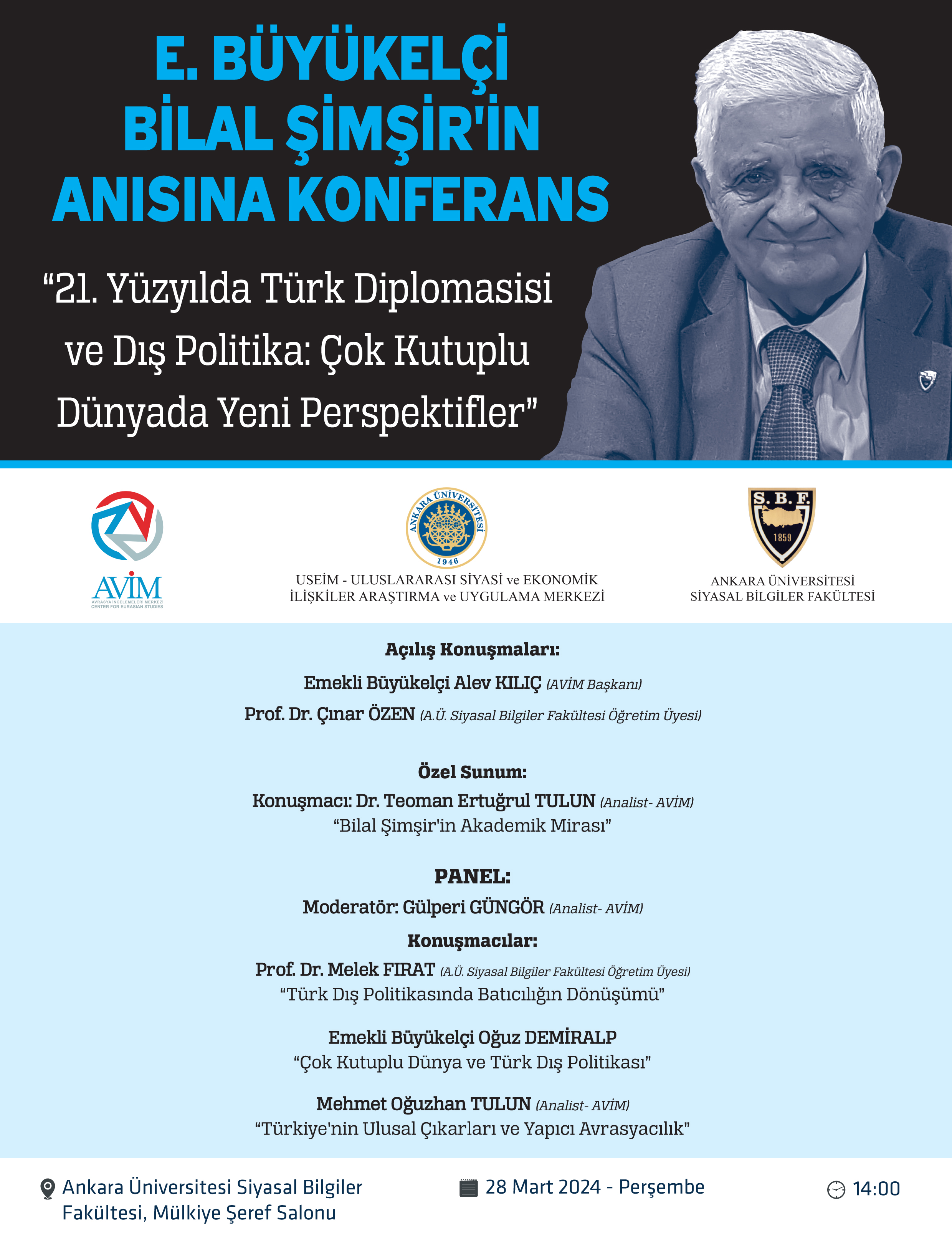 28 Mart 2024 Perşembe günü, Avrasya İncelemeleri Merkezi (AVİM) ve Ankara Üniversitesi Uluslararası Siyasi ve Ekonomik İlişkiler Araştırma ve Uygulama Merkezi (USEİM) işbirliğiyle Emekli Büyükelçi Bilal Şimşir'i anmak amacıyla bir konferans düzenlenecektir