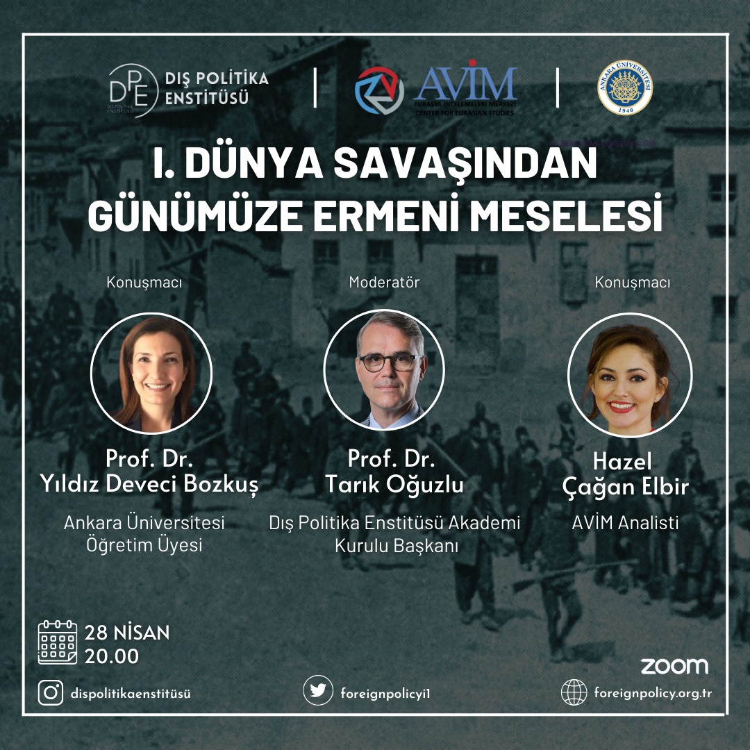 Dış Politika Enstitüsü (DPE), Avrasya İncelemeleri Merkezi (AVİM) ve Ankara Üniversitesi işbirliği ile 28 Nisan 2024 tarihinde ZOOM Platformu üzerinden “1. Dünya Savaşından Günümüze Ermeni Meselesi” başlıklı bir webinar düzenlenecektir. Moderatörlüğünü Dış Politika Enstitüsü Akademi Kurulu Başkanı Prof Dr. Tarık Oğuzlu’nun yapacağı webinarın konuşmacıları Ankara Üniversitesi Öğretim Üyesi Prof. Dr. Yıldız Deveci Bozkuş ve AVİM Analisti Hazel Çağan Elbir olacaktır.
