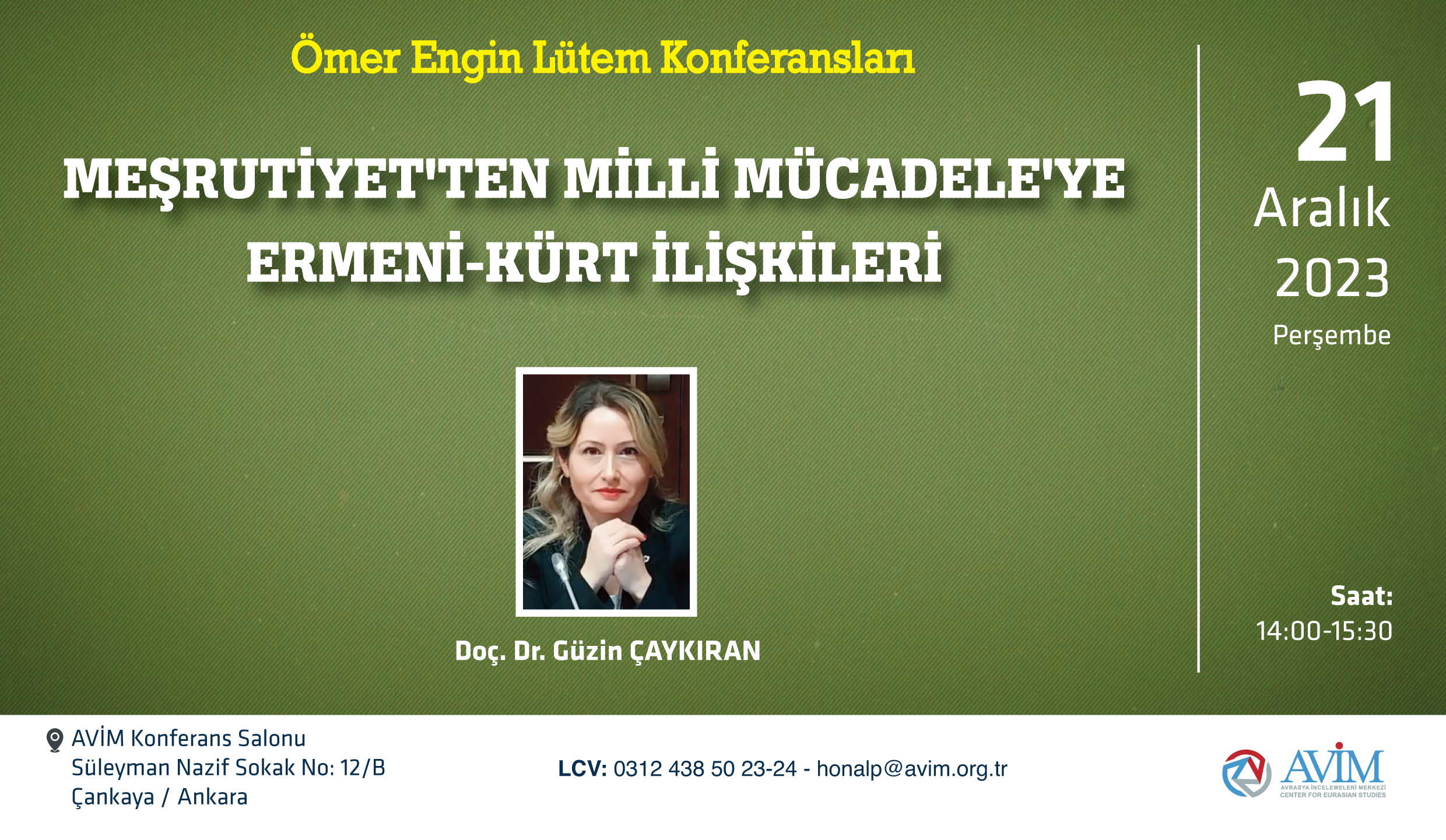 2023 yılı Ömer Engin Lütem Konferansları'nın sekizincisi Doç. Dr. Güzin Çaykıran’ın konuşmacı olduğu “Meşrutiyet'ten Milli Mücadele'ye Ermeni-Kürt İlişkileri” başlıklı konferans 21 Aralık 2023 Perşembe günü gerçekleşmiştir.