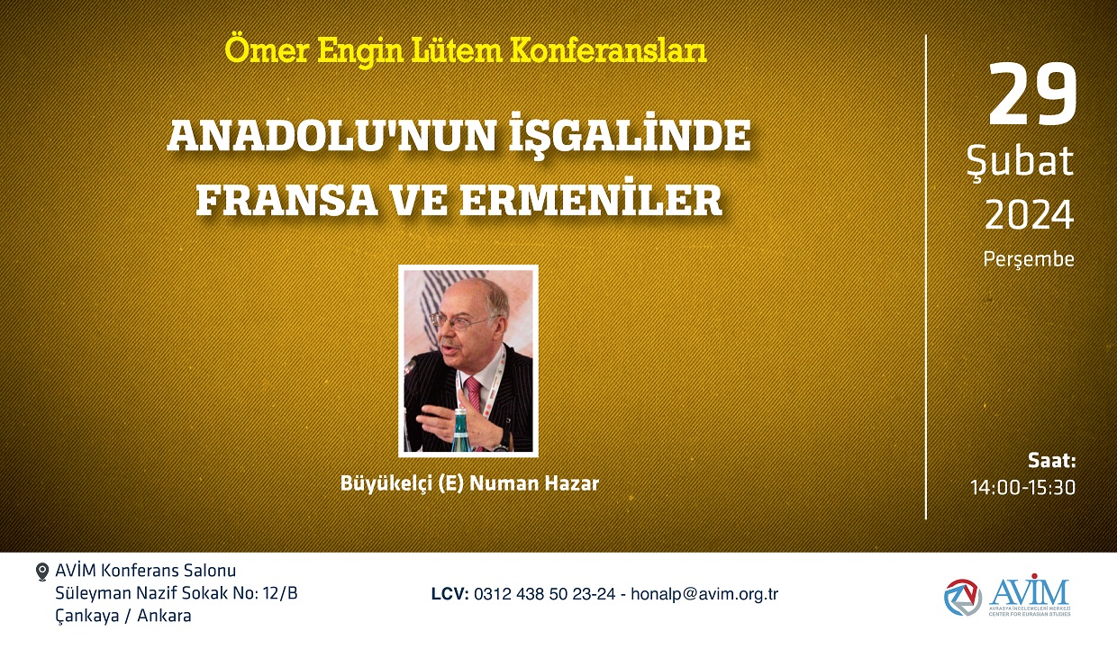2024 yılı Ömer Engin Lütem Konferansları'nın ikincisi Büyükelçi (E) Numan Hazar’ın konuşmacı olacağı “Anadolu’nun İşgalinde Fransa ve Ermeniler” başlıklı konferans 29 Şubat 2024 Perşembe günü gerçekleşecektir.
