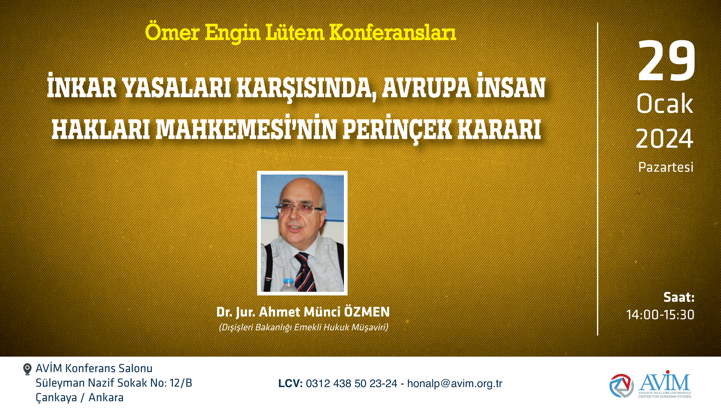 2024 yılı Ömer Engin Lütem Konferansları'nın ilki Dr. Jur. Ahmet Münci Özmen’in konuşmacı olacağı “İnkar Yasaları Karşısında, Avrupa İnsan Hakları Mahkemesi’nin (AİHM) Perinçek Kararı” başlıklı konferans 29 Ocak 2024 Pazartesi günü gerçekleşecektir.