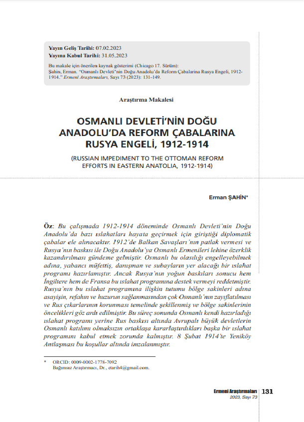 OSMANLI DEVLETİ’NİN DOĞU ANADOLU’DA REFORM ÇABALARINA RUSYA ENGELİ, 1912-1914 -