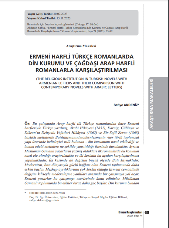 ERMENİ HARFLİ TÜRKÇE ROMANLARDA DİN KURUMU VE ÇAĞDAŞI ARAP HARFLİ ROMANLARLA KARŞILAŞTIRILMASI -