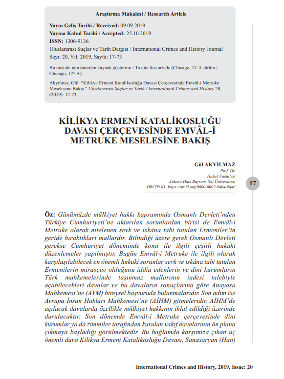 KİLİKYA ERMENİ KATALİKOSLUĞU DAVASI ÇERÇEVESİNDE EMVÂL-İ METRUKE MESELESİNE BAKIŞ -
