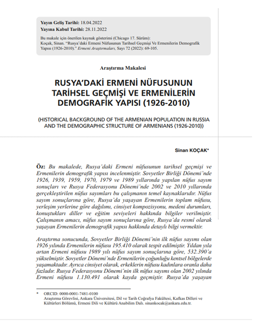 RUSYA’DAKİ ERMENİ NÜFUSUNUN TARİHSEL GEÇMİŞİ VE ERMENİLERİN DEMOGRAFİK YAPISI (1926-2010) -