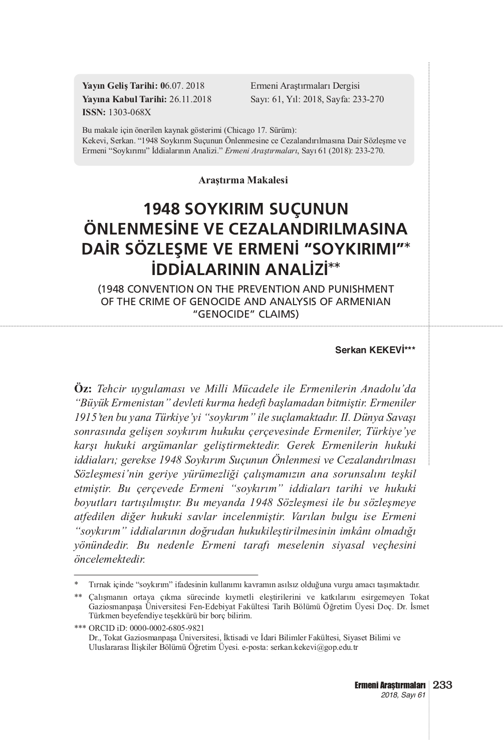 1948 SOYKIRIM SUÇUNUN ÖNLENMESİNE VE CEZALANDIRILMASINA DAİR SÖZLEŞME VE ERMENİ “SOYKIRIMI” İDDİALARININ ANALİZİ -
